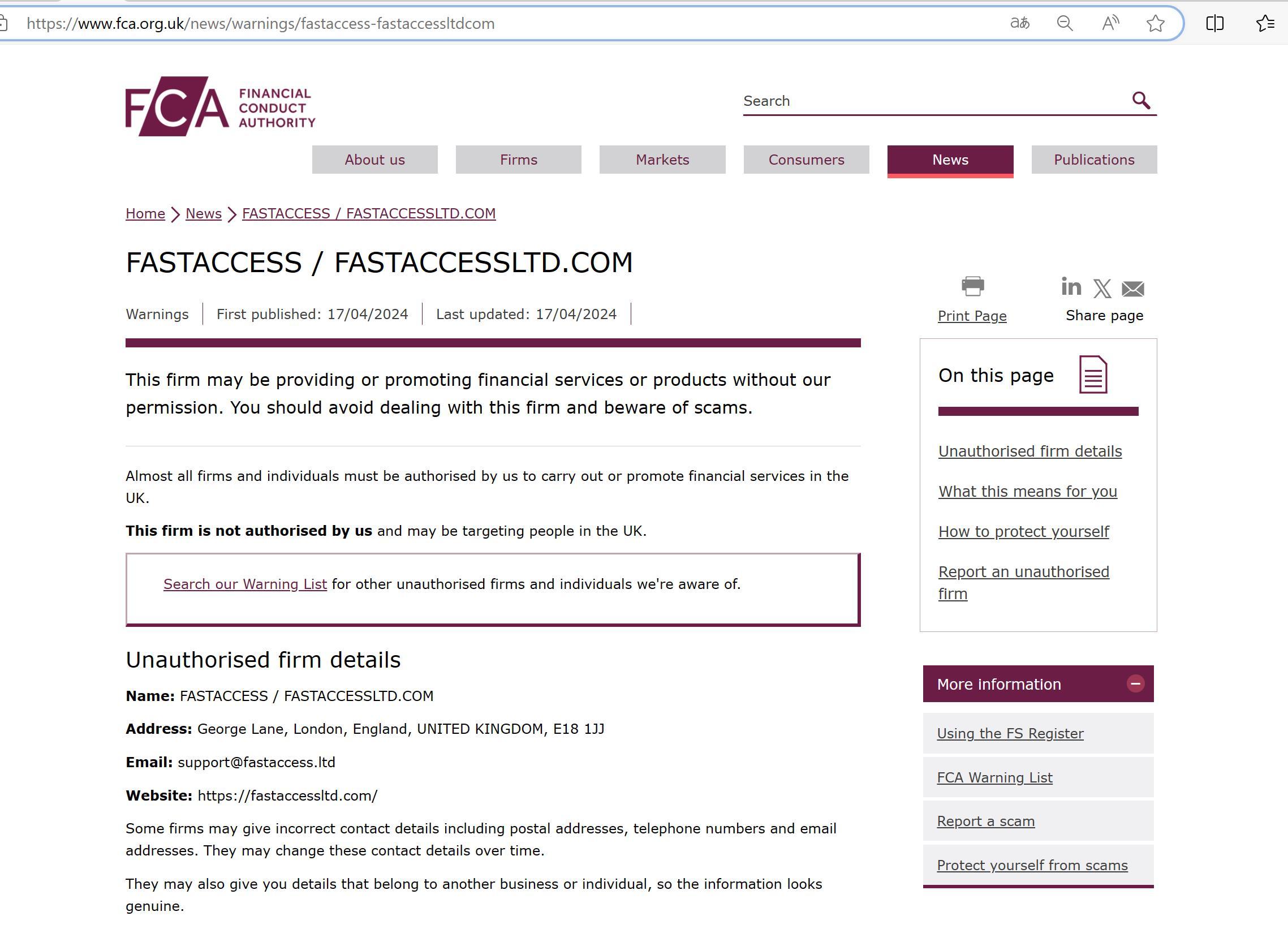 최초 게시일: 2024년 4월 17일 최종 업데이트일: 2024년 4월 17일 이 회사는 당사의 허가 없이 금융 서비스나 상품을 제공하거나 홍보할 수 있습니다. 이 회사와의 거래를 피하고 사기를 조심해야 합니다. 거의 모든 회사와 개인은 영국에서 금융 서비스를 수행하거나 홍보하기 위해 당사의 승인을 받아야 합니다. 이 회사는 우리의 승인을 받지 않았으며 영국에 있는 사람들을 대상으로 할 수 있습니다. 우리가 알고 있는 다른 승인되지 않은 회사 및 개인에 대한 경고 목록을 검색하십시오. 승인되지 않은 회사 세부정보 이름: FASTACCESS / FASTACCESSLTD .com 주소: george Lane, london, england, United Kingdom, e18 1jj 이메일: support@ FASTACCESS .ltd 웹사이트: https:// FASTACCESSLTD .com/ 일부 회사에서는 우편 주소, 전화번호, 이메일 주소 등 잘못된 연락처 정보를 제공할 수 있습니다. 시간이 지남에 따라 이러한 연락처 정보가 변경될 수 있습니다. 또한 다른 기업이나 개인에 속한 세부 정보를 제공할 수도 있으므로 정보가 진짜처럼 보입니다.