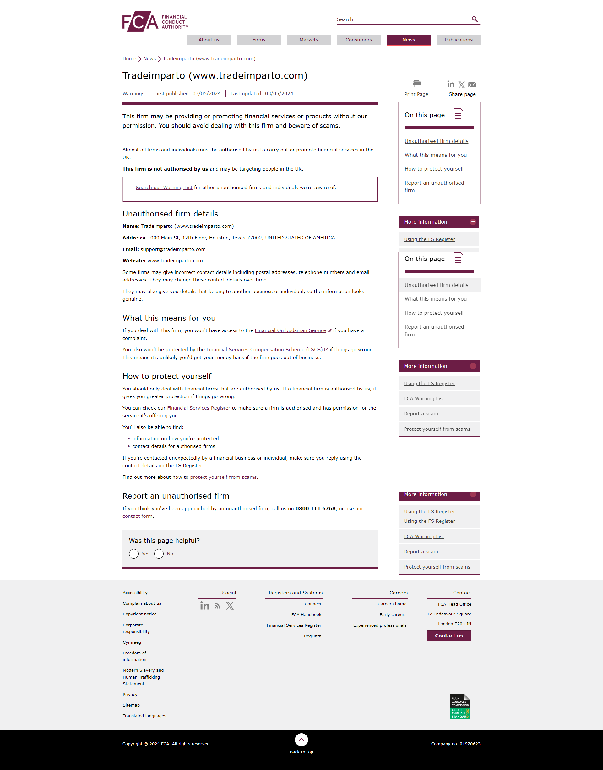 최초 게시일: 2024년 3월 5일 최종 업데이트일: 2024년 3월 5일 이 회사는 당사의 허가 없이 금융 서비스나 상품을 제공하거나 홍보할 수 있습니다. 이 회사와의 거래를 피하고 사기를 조심해야 합니다. 거의 모든 회사와 개인은 영국에서 금융 서비스를 수행하거나 홍보하기 위해 당사의 승인을 받아야 합니다. 이 회사는 우리의 승인을 받지 않았으며 영국에 있는 사람들을 대상으로 할 수 있습니다. 우리가 알고 있는 다른 승인되지 않은 회사 및 개인에 대한 경고 목록을 검색하십시오. 승인되지 않은 회사 세부정보 이름: Tradeimparto (www. Tradeimparto .com) 주소: 1000 main st, 12th Floor, houston, texas 77002, America of America 이메일: support@ Tradeimparto .com 웹사이트: www. Tradeimparto .com 일부 회사에서는 우편 주소, 전화번호, 이메일 주소 등 잘못된 연락처 정보를 제공할 수 있습니다. 시간이 지남에 따라 이러한 연락처 정보가 변경될 수 있습니다. 또한 다른 기업이나 개인에 속한 세부 정보를 제공할 수도 있으므로 정보가 진짜처럼 보입니다.