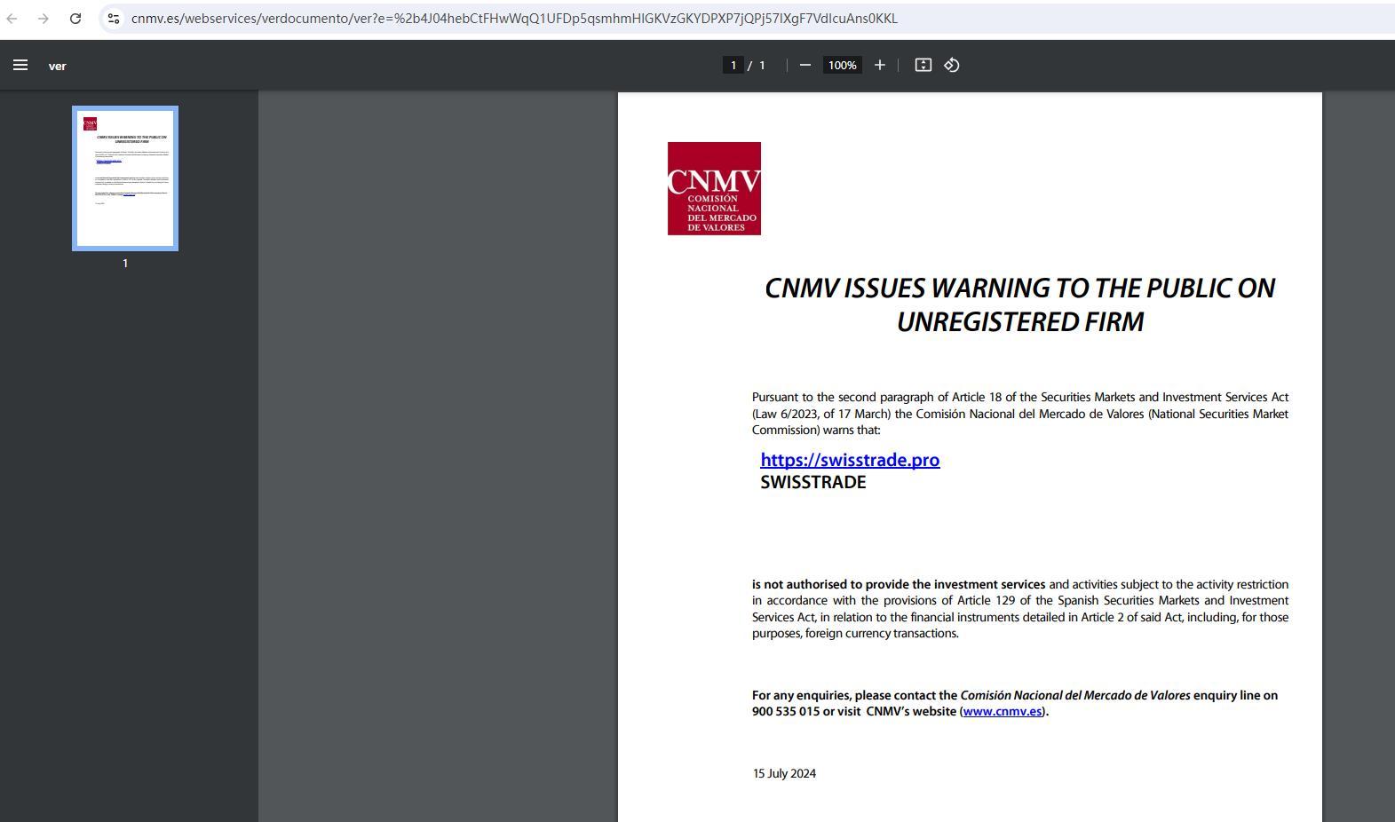 cnmv는 증권시장 및 투자서비스법(2023년 3월 17일 법률 6/2023) 제18조 2항에 따라 등록되지 않은 회사에 대해 대중에게 경고를 발령했습니다. 국가증권시장위원회(Comisión nacional del mercado de valores)는 다음과 같이 경고합니다. https:// SwissTrade .찬성 SwissTrade 스페인 증권 시장 및 투자 서비스법 제129조에 따라 활동 제한에 따른 투자 서비스 및 활동을 제공할 권한이 없으며, 해당 법 제2조에 자세히 설명된 금융 상품과 관련하여 외화 거래를 포함합니다. 문의 사항이 있는 경우 900 535 015번으로 Comisión nacional del mercado de valores 문의 전화로 연락하거나 cnmv 웹사이트(www.cnmv.es)를 방문하세요. 2024년 7월 15일