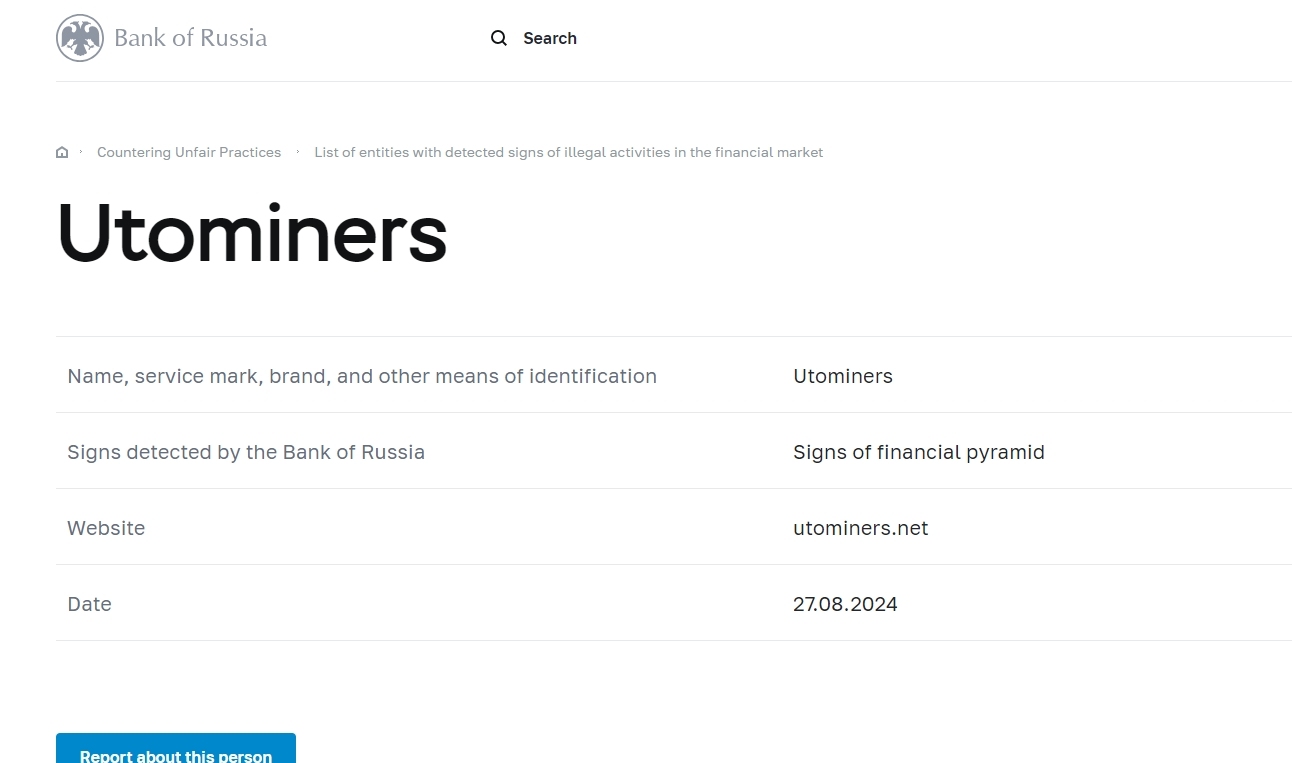이름, 서비스 마크, 브랜드 및 기타 식별 수단 Utominers 러시아 은행이 감지한 징후 금융 피라미드 웹사이트의 징후 Utominers .net 날짜 27.08.2024
