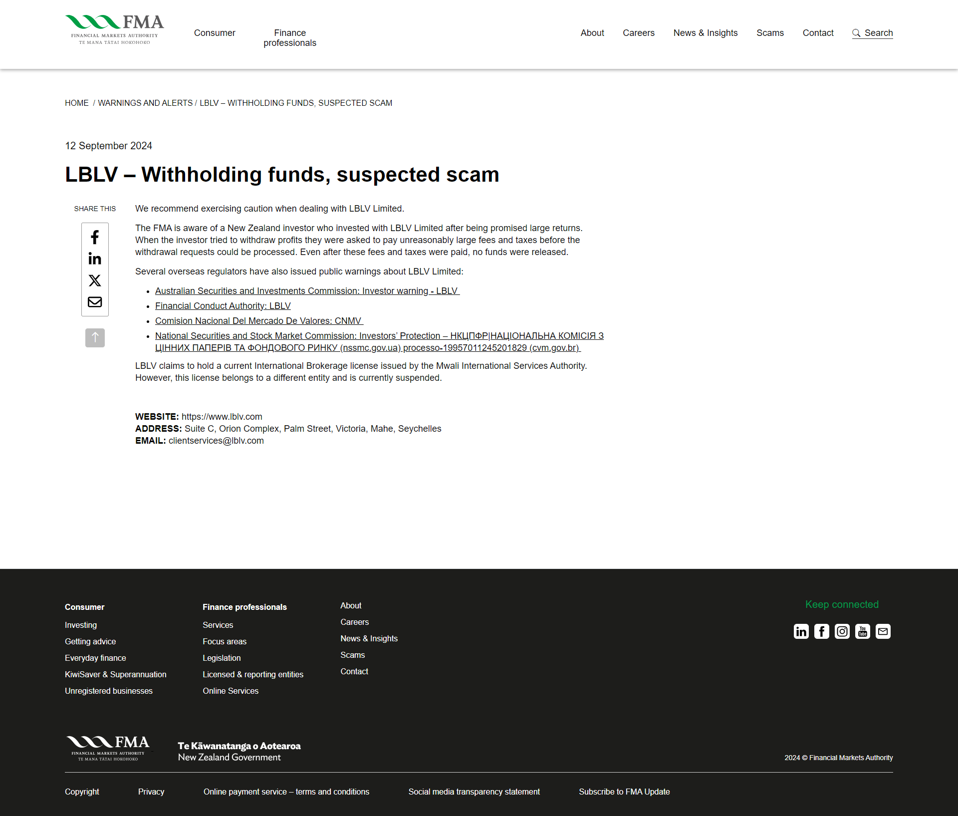 2024년 9월 12일 LBLV – 자금 보류, 의심되는 사기 이를 공유하려면 거래 시 주의를 기울이는 것이 좋습니다. LBLV 제한됨. FMA는 뉴질랜드 투자자가 투자한 사실을 알고 있습니다. LBLV 큰 수익을 약속받았지만 제한되었습니다. 투자자가 수익을 인출하려고 했을 때 인출 요청을 처리하기 전에 부당하게 큰 수수료와 세금을 지불하라는 요청을 받았습니다. 이러한 수수료와 세금을 지불한 후에도 자금은 출금되지 않았습니다. 몇몇 해외 규제 기관도 이에 대해 공개적으로 경고를 발표했습니다. LBLV 제한됨: 호주 증권 및 투자 위원회: 투자자 경고 - LBLV 금융 행위 기관: LBLV comision nacional del mercado de valores: cnmv 국가 증권 및 주식 시장 위원회: 투자자 보호 – нкцпфр|національна комісія з цінних паперів та фондового ринку(nssmc.gov.ua) processo-19957011245201829 cvm.gov.br) LBLV 현재 mwali 국제 서비스 기관에서 발급한 국제 중개 라이선스를 보유하고 있다고 주장합니다. 그러나 이 라이선스는 다른 기관에 속하며 현재 정지된 상태입니다. 웹사이트: https://www. LBLV .com 주소: suite c, orion complex, palm street, victoria, mahe, seychelles 이메일: clientservices@ LBLV .com