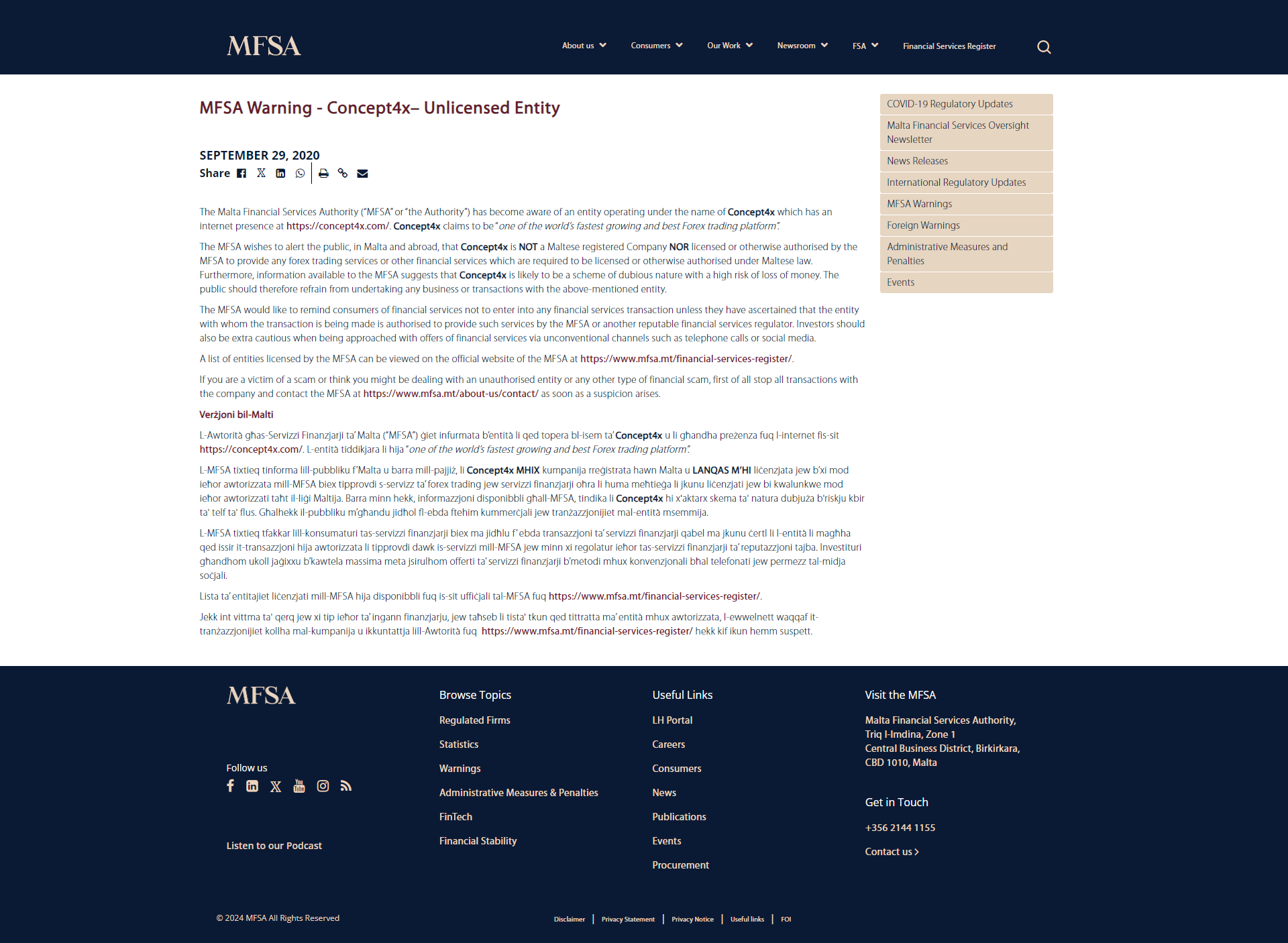 mfsa 경고 - Concept4x – 무면허 기관 2020년 9월 29일 공유 몰타 금융 서비스 기관("mfsa" 또는 "기관")은 다음 이름으로 운영되는 기관을 알게 되었습니다. Concept4x https://에 인터넷 존재가 있습니다 Concept4x .com/. Concept4x "세계에서 가장 빠르게 성장하고 최고의 외환 거래 플랫폼 중 하나"라고 주장합니다. MFSA는 몰타와 해외의 대중에게 다음과 같은 사실을 알리고자 합니다. Concept4x 는 몰타에 등록된 회사가 아니며 MFSA로부터 라이선스를 받거나 달리 승인을 받지 않아 몰타법에 따라 라이선스를 받거나 달리 승인을 받아야 하는 외환 거래 서비스나 기타 금융 서비스를 제공할 수 없습니다. 또한 MFSA에서 제공하는 정보에 따르면 다음과 같습니다. Concept4x 높은 자금 손실 위험이 있는 의심스러운 성격의 계획일 가능성이 높습니다. 따라서 대중은 위에 언급된 기관과 어떠한 사업이나 거래도 하지 않아야 합니다. MFSA는 금융 서비스 소비자에게 거래 대상 기관이 MFSA 또는 다른 평판 있는 금융 서비스 규제 기관에서 해당 서비스를 제공할 수 있는 권한을 부여받았는지 확인하기 전까지는 어떠한 금융 서비스 거래도 하지 말 것을 상기시키고자 합니다. 투자자는 또한 전화 통화나 소셜 미디어와 같은 비전통적인 채널을 통해 금융 서비스 제공을 제안받을 때 특히 조심해야 합니다. MFSA에서 허가를 받은 기관 목록은 MFSA 공식 웹사이트 https://www.mfsa.mt/financial-services-register/에서 볼 수 있습니다. 귀하가 사기의 피해자이거나 승인되지 않은 단체 또는 기타 유형의 금융 사기를 상대하고 있다고 생각되는 경우, 우선 회사와의 모든 거래를 중단하고 의심이 되는 즉시 https://www.mfsa.mt/about-us/contact/를 통해 mfsa에 문의하십시오. verżjoni bil-malti l-awtorità għas-servizzi finanzjarji ta' Malta (“mfsa”) ġiet infurmata b'entità li qed topera bl-isem ta' Concept4x u li għandha preżenza fuq l-internet fis-sit https:// Concept4x .com/. l-entità tiddikjara li hija “세계에서 가장 빠르게 성장하고 있는 최고의 외환 거래 플랫폼 중 하나”입니다. l-mfsa tixtieqtinforma lill-pubbliku f'malta u barra mill-pajjiż, li Concept4x mhix kumpanija rreġistrata hawn 몰타 u lanqas m'hi liċenzjata jew b'xi mod ieħor awtorizzata mill-mfsa biextipprovdi s-servizz ta' 외환 거래 jew servizzi finanzjarji oħra li huma meħtieġa li jkunu liċenzjati jew bi kwalunkwe mod ieħor awtorizz ati taħt il-liġi maltija. barra minn hekk, informazzjoni disponibbli għall-mfsa, Tindika li Concept4x 안녕하세요 x'aktarx skema ta' natura dubjuża b'riskju kbir ta' telf ta' flus. għalhekk il-pubbliku m'għandu jidħol fl-ebda ftehim kummerċjali jew tranżazzjonijiet Mal-entità msemmija. l-mfsa tixtieq tfakkar lill-konsumaturi tas-servizzi finanzjarji biex ma jidħlu f' ebda transazzjoni ta' servizzi finanzjarji qabel ma jkunu ċerti li l-entità li magħha qed issir it-transazzjoni hija awtorizzata litipprovdi dawk is-servizzi mill-mfsa jew minn xi regolatur ieħor tas-servizzi finanzjarji ta' reputazzjoni tajba. Investituri għandhom ukoll jaġixxu b'kawtela Massima Meta jsirulhom Offerti ta' servizzi finanzjarji b'metodi mhux konvenzjonali bħal telefonati jew permezz tal-midja soċjali. 목록에 있는 항목은 mill-mfsa hija disponibbli fuq is-sit uffiċjali tal-mfsa fuq https://www.mfsa.mt/financial-services-register/입니다. jekk int vittma ta' qerq jew xitip ieħor ta' ingann finanzjarju, jew taħseb li tista' tkun qed tittratta ma' entità mhux awtorizzata, l-ewwelnett waqqaf it-tranżazzjonijiet kollha mal-kumpanija u ikkuntattja lill-awtorità fuq https://www. mfsa.mt/financial-services-register/ hekk kif ikun hemm suspett.