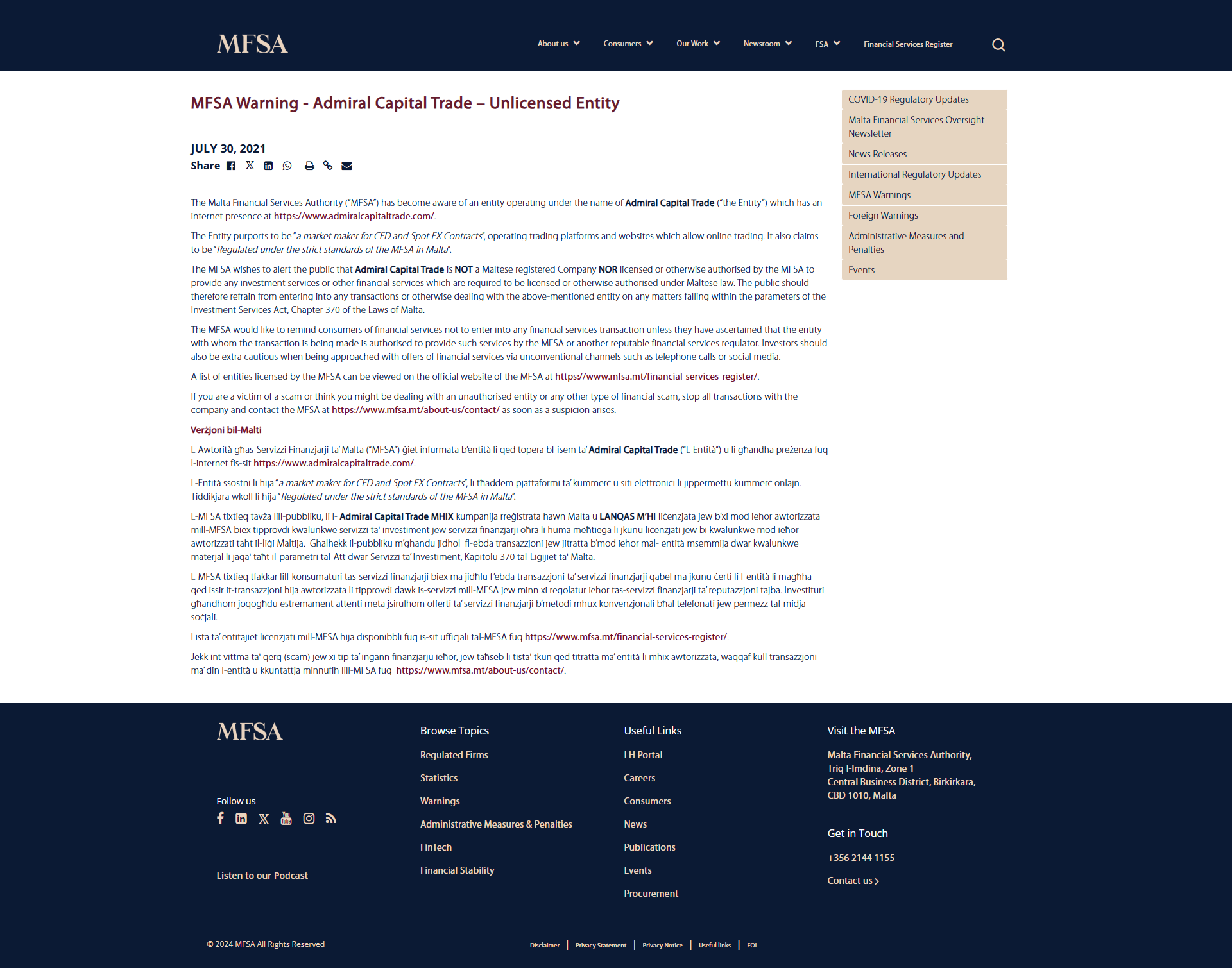 mfsa 경고 - Admiral Capital Trade – 무면허 사업체