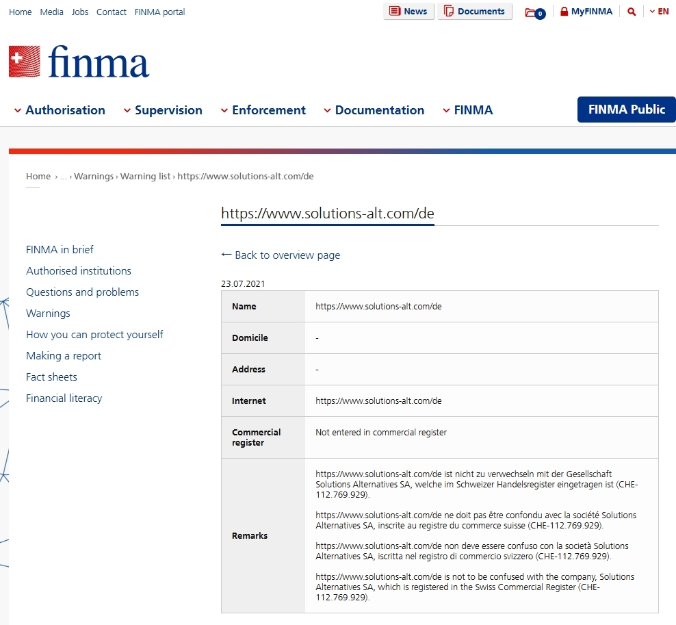 승인되지 않은 회사 및 개인에 대한 경고 목록 경고 목록 https://www.solutions-alt.com/de.