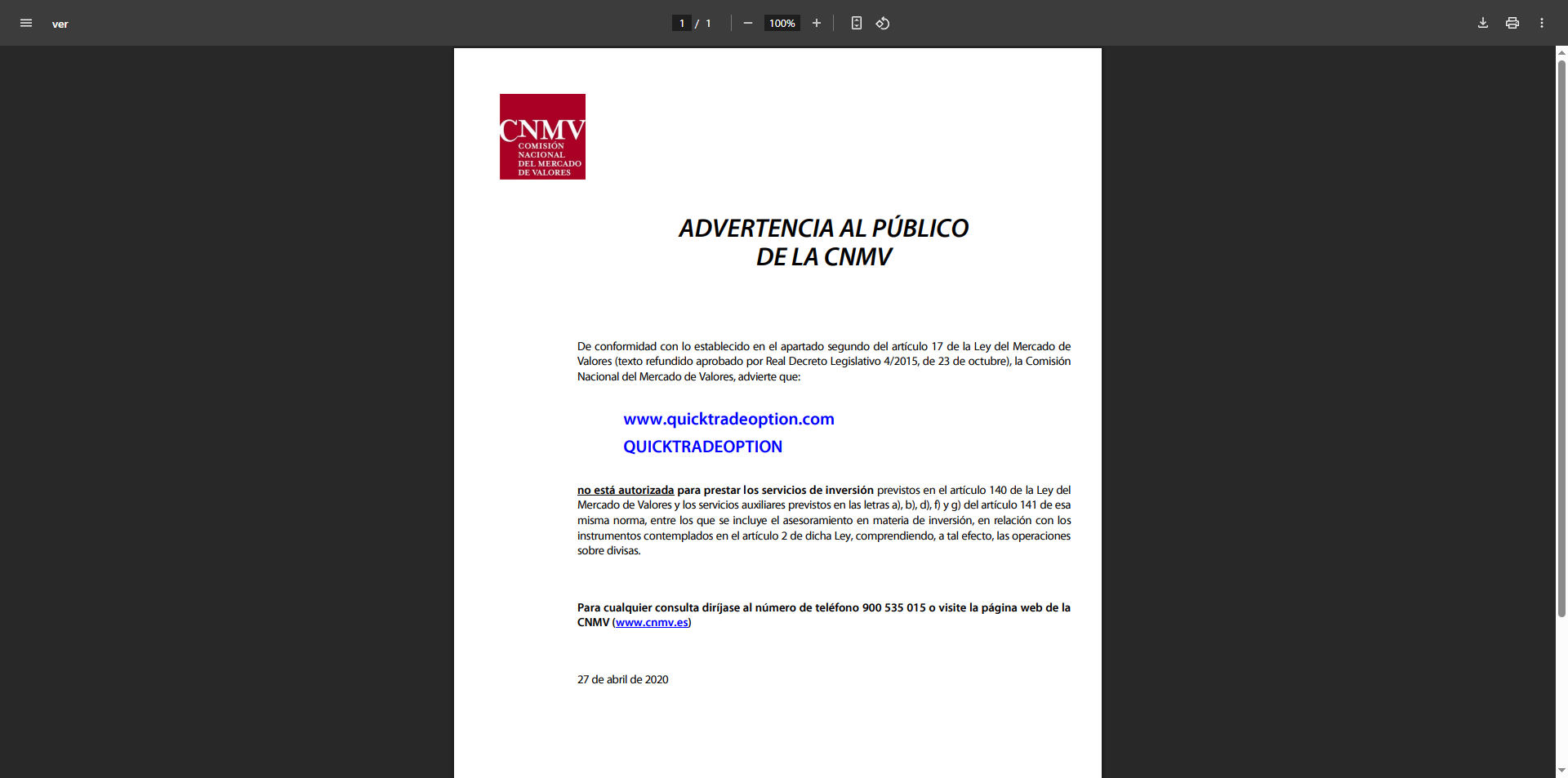 CNMV의 공개 경고 증권시장법(2015년 10월 23일 왕립 입법령 4/2015에 의해 승인된 통합 텍스트) 제17조 2항의 규정에 따라, 국가 증권시장위원회는 다음과 같이 경고합니다: www.quicktradeoption.com QUICKTRADEOPTION은 증권시장법 제140조에 규정된 투자 서비스와 같은 법 제141조 a), b), d), f), g)에 규정된 보조 서비스(투자 자문 포함)를 제공할 권한이 없으며, 해당 법 제2조에 명시된 수단과 관련하여 이러한 서비스에는 외환 거래도 포함됩니다. 질문이 있으시면 900 535 015로 전화하시거나 CNMV 웹사이트(www.cnmv.es)를 방문하세요. 2020년 4월 27일