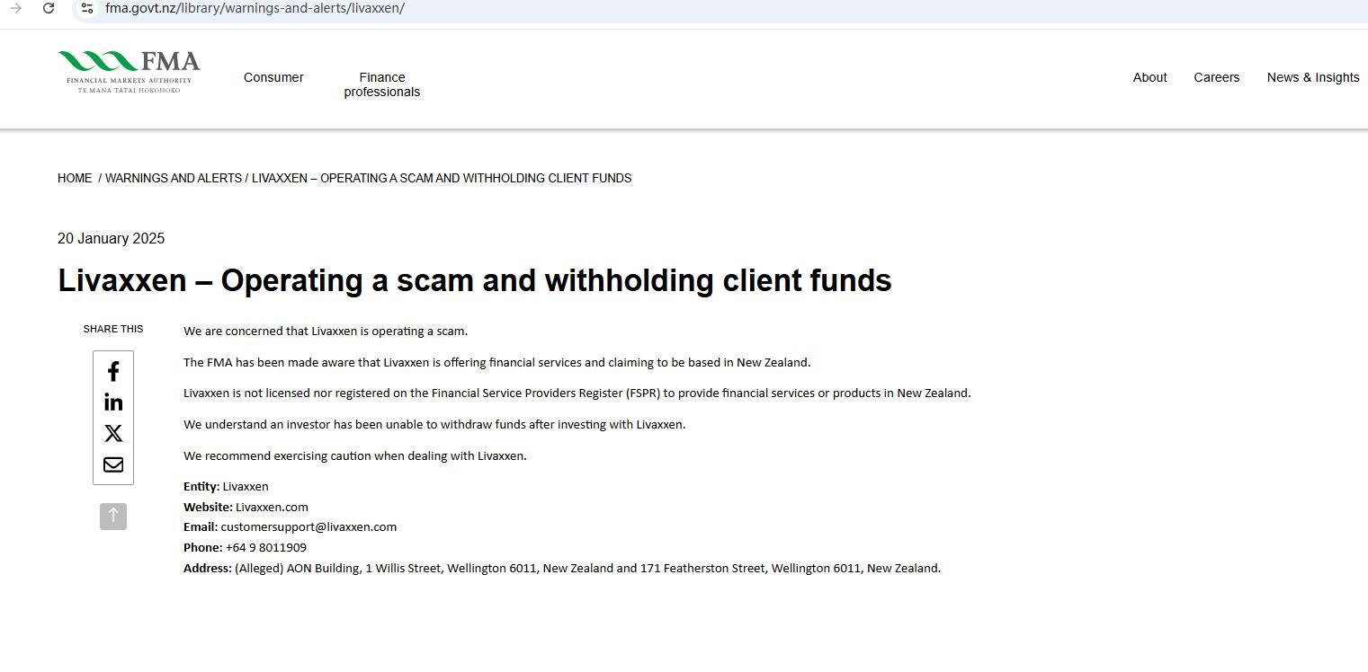 2025년 1월 20일 Livaxxen – 사기를 저지르고 고객 자금을 은닉하는 행위에 대해 우리는 다음과 같이 우려하고 있습니다. Livaxxen 사기를 저지르고 있습니다. FMA는 이 사실을 알게 되었습니다. Livaxxen 뉴질랜드에 본사를 두고 있다고 주장하며 금융 서비스를 제공합니다. Livaxxen 뉴질랜드에서 금융 서비스 또는 상품을 제공하기 위해 금융 서비스 제공자 등록부(FSPR)에 등록되거나 허가되지 않았습니다. 투자자가 투자 후 자금을 인출할 수 없었던 것으로 알고 있습니다. Livaxxen . 우리는 다룰 때 주의를 기울이는 것이 좋습니다. Livaxxen . 엔티티: Livaxxen 웹사이트: Livaxxen .com 이메일: customersupport@ Livaxxen .com 전화: +64 9 8011909 주소: (추정) AON 빌딩, 1 윌리스 스트리트, 웰링턴 6011, 뉴질랜드 및 171 페더스턴 스트리트, 웰링턴 6011, 뉴질랜드.