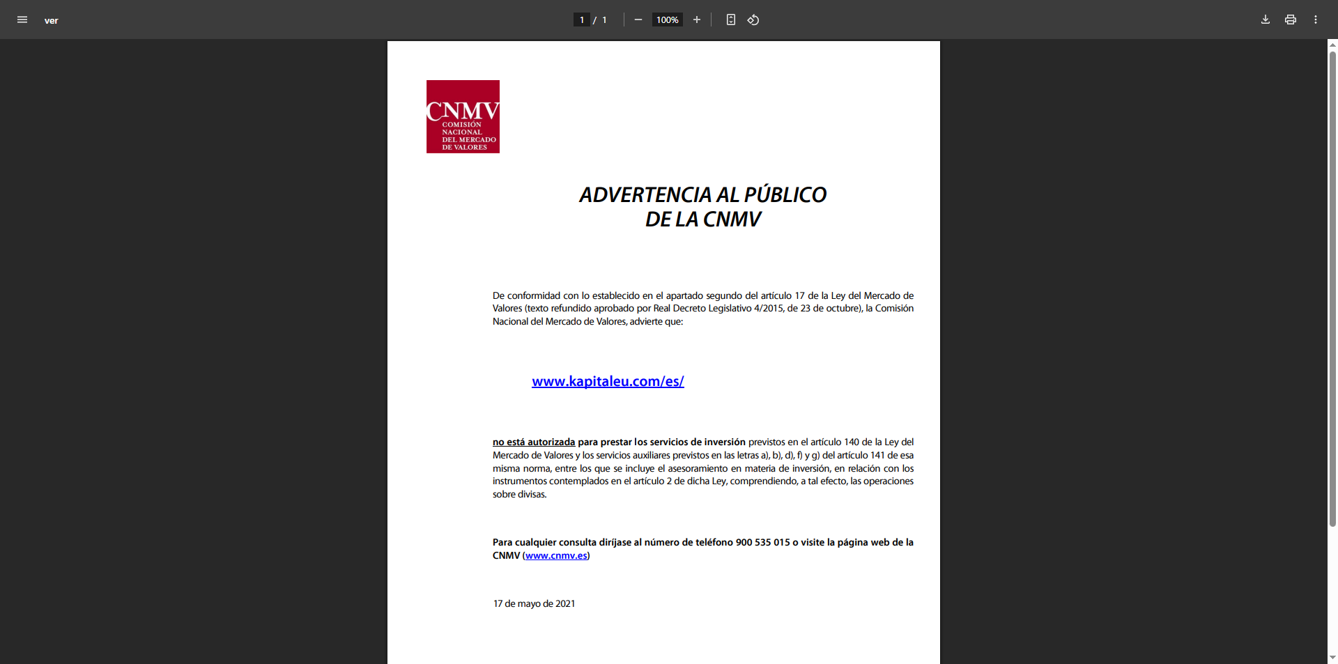 증권시장법 제17조 제2항 규정에 의거한 CNMV의 공고(2015년 10월 23일 왕립 입법령 4/2015에 의해 승인된 통합 텍스트), 국가증권시장위원회는 다음과 같이 경고합니다: http://www. KapitalEU .com/es/는 증권시장법 제140조에 명시된 투자 서비스와 동법 제141조 a), b), d), f), g)에 명시된 보조 서비스(투자 자문 포함)를 제공할 권한이 없습니다. 이는 동법 제2조에 명시된 상품과 관련된 투자 자문 서비스로, 이 목적을 위한 외환 거래도 포함됩니다. 질문이 있으시면 900 535 015로 전화하시거나 CNMV 웹사이트(www.cnmv.es)를 방문하세요. 2021년 5월 17일