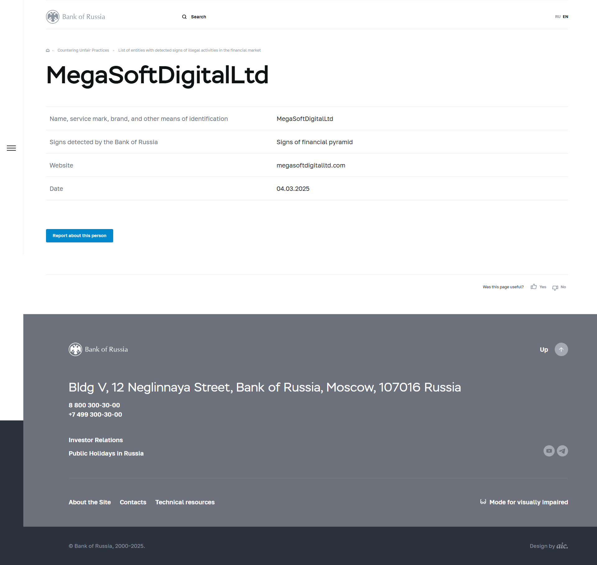 이름, 서비스 마크, 브랜드 및 기타 식별 수단 MegaSoftDigitalLtd 러시아 은행에서 감지한 신호 금융 피라미드의 신호 웹사이트 megasoftdigitalltd.com 날짜 04.03.2025