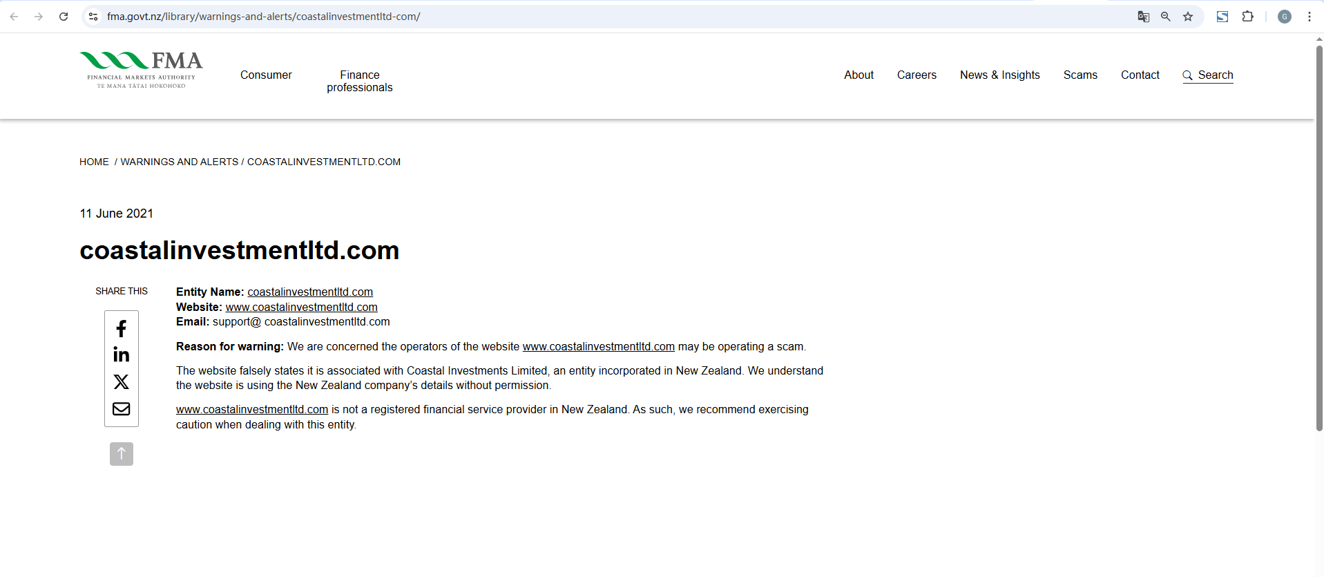 2021년 6월 11일 coastalinvestmentltd.com 이 엔터티 이름 공유: coastalinvestmentltd.com 웹사이트: www.coastalinvestmentltd.com 이메일: support@ coastalinvestmentltd.com 경고 이유: 저희는 웹사이트 www.coastalinvestmentltd.com의 운영자가 사기를 저지르고 있을 수 있다는 우려를 가지고 있습니다. 웹사이트는 다음과 관련이 있다고 거짓으로 명시합니다. Coastal Investment s limited는 뉴질랜드에 법인으로 설립된 회사입니다. 당사는 해당 웹사이트가 허가 없이 뉴질랜드 회사의 정보를 사용하고 있다는 사실을 알고 있습니다. www.coastalinvestmentltd.com은 뉴질랜드에 등록된 금융 서비스 제공업체가 아닙니다. 따라서 이 회사와 거래할 때는 주의를 기울이시기를 권고합니다.