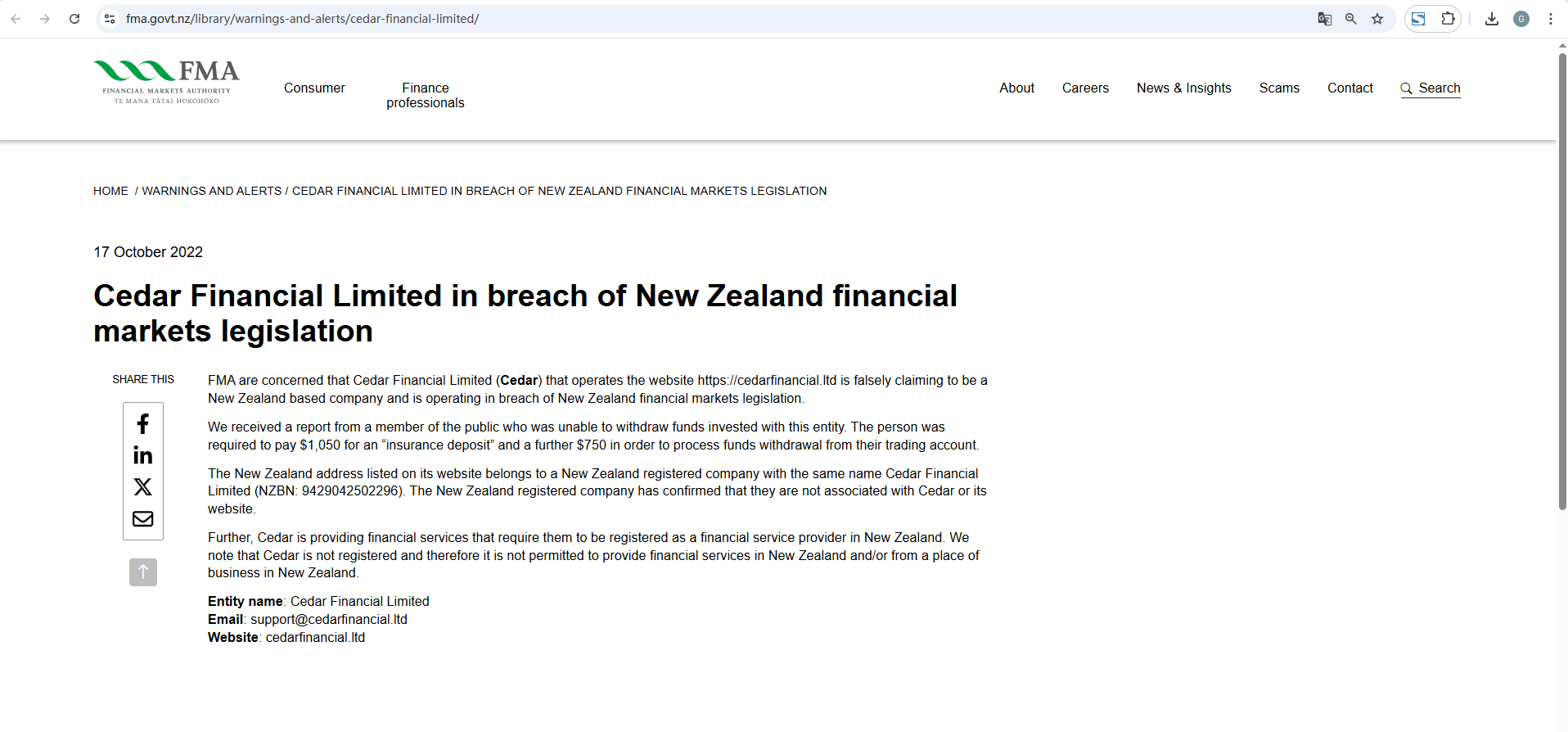 2022년 10월 17일 CEDAR FINANCIAL 뉴질랜드 금융 시장 법률 위반으로 제한됨 이 FMA는 이에 대해 우려하고 있습니다. CEDAR FINANCIAL 웹사이트 https://cedarfinancial.ltd를 운영하는 (cedar) limited는 뉴질랜드에 본사를 둔 회사라고 거짓 주장하고 있으며 뉴질랜드 금융 시장 법률을 위반하여 운영하고 있습니다. 우리는 이 법인에 투자한 자금을 인출할 수 없었던 일반인으로부터 보고를 받았습니다. 그 사람은 "보험 보증금"으로 1,050달러를 지불해야 했고 거래 계좌에서 자금 인출을 처리하기 위해 추가로 750달러를 지불해야 했습니다. 웹사이트에 나와 있는 뉴질랜드 주소는 같은 이름을 가진 뉴질랜드 등록 회사에 속합니다. CEDAR FINANCIAL limited(nzbn: 9429042502296). 뉴질랜드 등록 회사는 Cedar 또는 해당 웹사이트와 관련이 없음을 확인했습니다. 또한 Cedar는 뉴질랜드에서 금융 서비스 제공자로 등록해야 하는 금융 서비스를 제공하고 있습니다. Cedar는 등록되지 않았으므로 뉴질랜드에서 또는 뉴질랜드의 사업장에서 금융 서비스를 제공할 수 없습니다. 법인 이름: CEDAR FINANCIAL 제한된 이메일: support@cedarfinancial.ltd 웹사이트: cedarfinancial.ltd