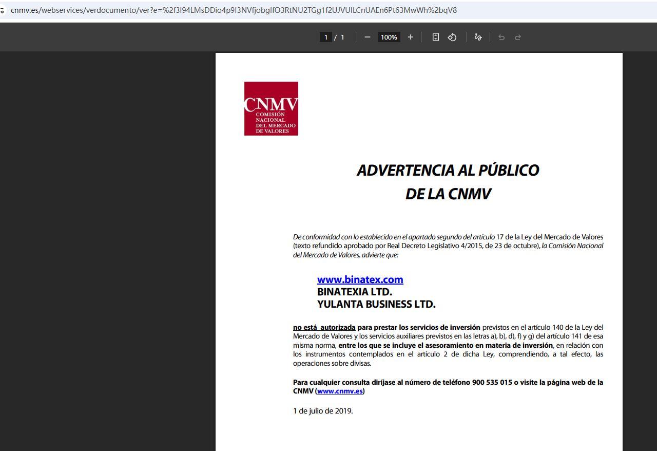 공개 경고 CNMV 증권시장법 제17조 제2항(2015년 10월 23일 왕립 입법령 4/2015로 승인된 통합문서)의 규정에 따라, 국가증권시장위원회는 다음과 같이 경고합니다. www.binatex.com BINATEXIA LTD. YULANTA BUSINESS LTD. 증권시장법 제140조에 규정된 투자 서비스 및 동법 제141조 a), b), d), f), g)에 규정된 보조 서비스를 제공할 권한이 없습니다. 여기에는 동법 제2조에 명시된 상품과 관련된 투자 자문이 포함되며, 이러한 목적상 외환 거래도 포함됩니다. 문의 사항은 900 535 015번으로 전화하시거나 CNMV 웹사이트(www.cnmv.es)를 방문하세요. 2019년 7월 1일.