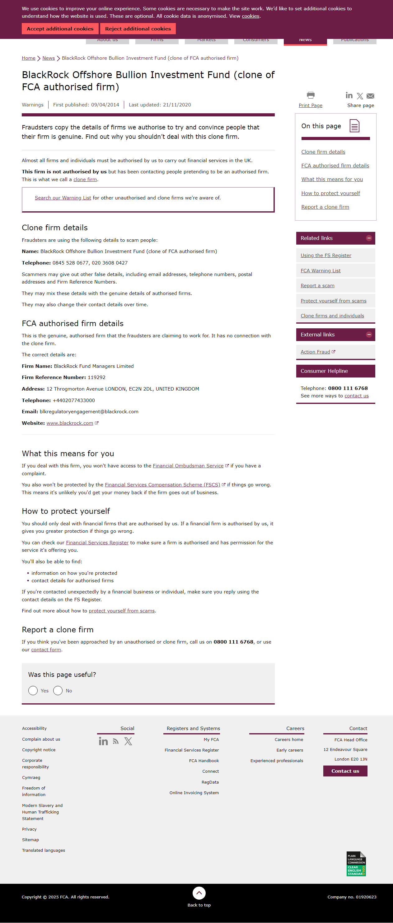 사기꾼들은 저희가 승인한 회사의 정보를 복제하여 사람들에게 자신들의 회사가 진짜라고 믿게 하려고 합니다. 이 복제 회사와 거래해서는 안 되는 이유를 알아보세요. 이 페이지에서 복제 회사 정보 FCA 승인 회사 정보 자신을 보호하는 방법 복제 회사 신고 영국에서 금융 서비스를 제공하려면 거의 모든 회사와 개인이 저희의 승인을 받아야 합니다. 이 회사는 저희의 승인을 받지 않았지만, 승인된 회사인 척하며 사람들에게 연락해 왔습니다. 저희는 이를 복제 회사라고 부릅니다. 저희가 알고 있는 다른 무단 복제 회사 및 복제 회사는 저희 경고 목록에서 검색하세요. 복제 회사 정보 사기꾼들은 다음 정보를 사용하여 사기를 치고 있습니다. 이름: BlackRock Offshore Bullion Investment Fund (FCA 승인 회사의 복제 회사) 전화번호: 0845 528 0677, 0203608 0427 사기꾼은 이메일 주소, 전화번호, 우편 주소, 회사 참조 번호 등 허위 정보를 제공할 수 있습니다. 사기꾼은 이러한 정보를 공인된 회사의 실제 정보와 혼합할 수 있습니다. 또한 시간이 지남에 따라 연락처 정보를 변경할 수도 있습니다. FCA 공인 회사 정보 사기꾼이 근무한다고 주장하는 실제 공인 회사입니다. 복제 회사와는 아무런 관련이 없습니다. 정확한 정보는 다음과 같습니다. 회사명: BlackRock Fund Managers Limited 회사 참조 번호: 119292 주소: 12 Throgmorton Avenue 런던, EC2N 2DL, 영국 전화번호: +4402077433000 이메일: [email protected] 웹사이트: www.blackrock.com.