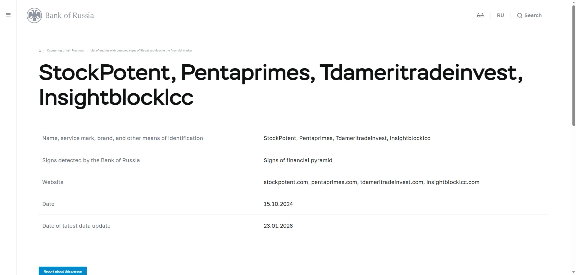 이름, 서비스 마크, 브랜드 및 기타 식별 수단 스톡포텐트, 펜타프라임스 러시아 중앙은행이 감지한 징후 금융 피라미드의 징후 웹사이트 stockpotent.com, pentaprimes.com 날짜 2024년 10월 15일.