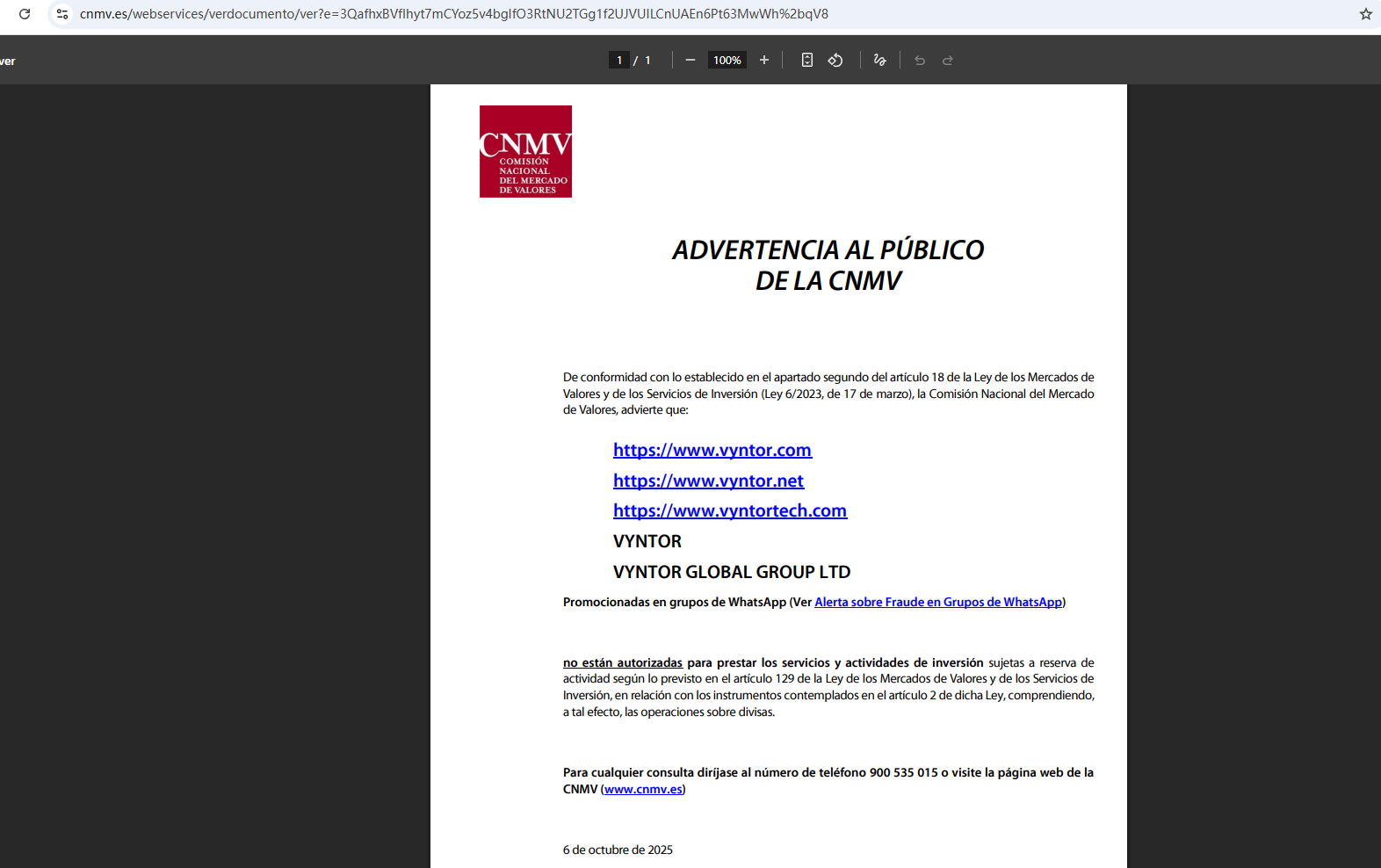 증권 및 투자 서비스 시장법(2023년 3월 17일자 법률 6/2023) 제18조 제2항에 따라, 국가 증권 시장 위원회는 다음과 같이 경고합니다: WhatsApp 그룹에서 홍보되는 (WhatsApp 그룹 사기 경고 참조) 투자 서비스 및 활동은 승인을 받지 않았습니다. 증권시장 및 투자서비스법 제129조에 따라 예약된 활동에 따라, 동법 제2조에 명시된 금융상품과 관련하여 통화 거래를 포함합니다. 문의 사항이 있으시면 전화번호 900 535 015로 연락하거나 CNMV(www.cnmv.es) 웹사이트를 방문해 주십시오. 6월 10월 2025년 https://www.vyntor.com https://www.vyntor.net https://www.vyntortech.com VYNTOR VYNTOR GLOBAL GROUP LTD.