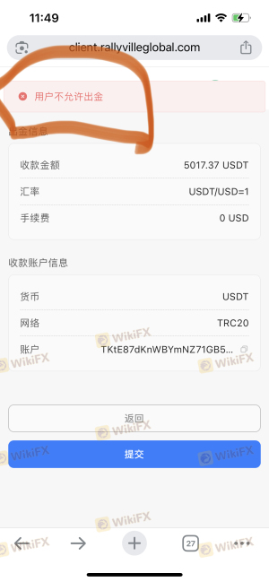 已经一个多星期了,发了邮件给客服也完全没有回复。正常交易盈利了被指违规交易。锁仓高频交易这种的。而且完全没有这类交易情况。就随便找个理由说不给出金.RallyVille(RV)这个平台注意一下。尽量撤离。不然赚钱多了也会不给出金的。
