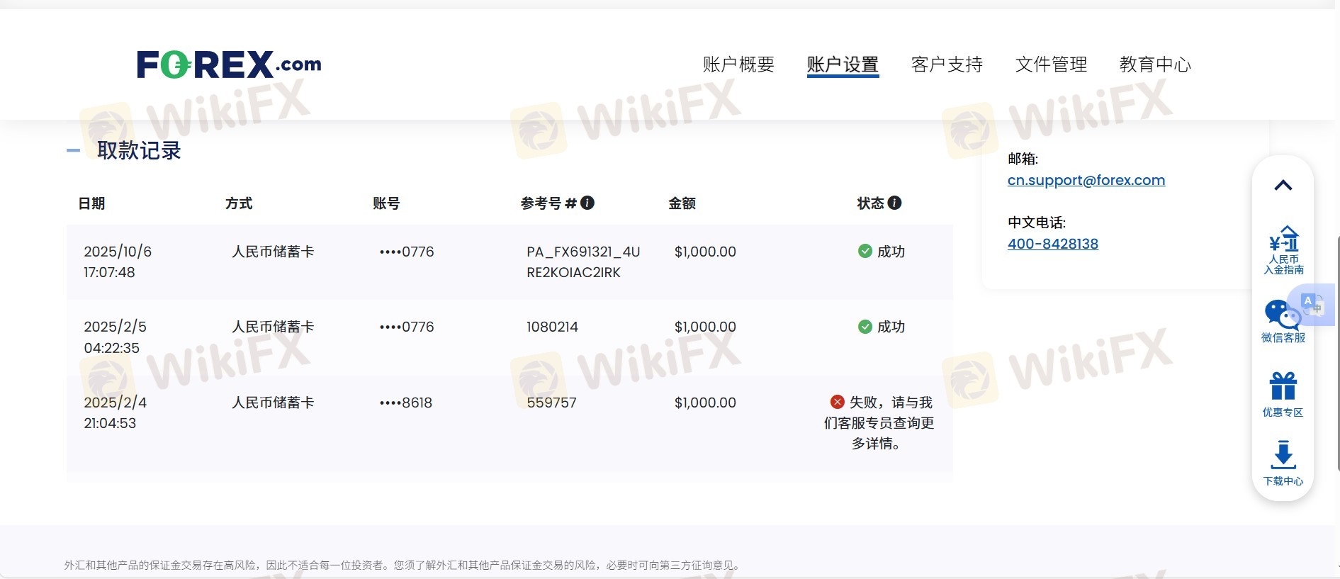 Forex.com은 지역 온라인 이체, 신용/직불 카드, 와이어 이체, Neteller 및 Skrill과 같은 다양한 결제 방법을 제공합니다. 입금은 24시간 이내에 처리되므로 거래자는 빠르게 거래를 시작할 수 있습니다. 인출도 빠르며 일반적으로 1-2 영업일 정도 소요됩니다. Forex.com은 입금 또는 인출에 대해 추가 수수료를 부과하지 않지만, 결제 서비스 제공업체가 독자적인 수수료를 부과할 수 있음을 유의해야 합니다.