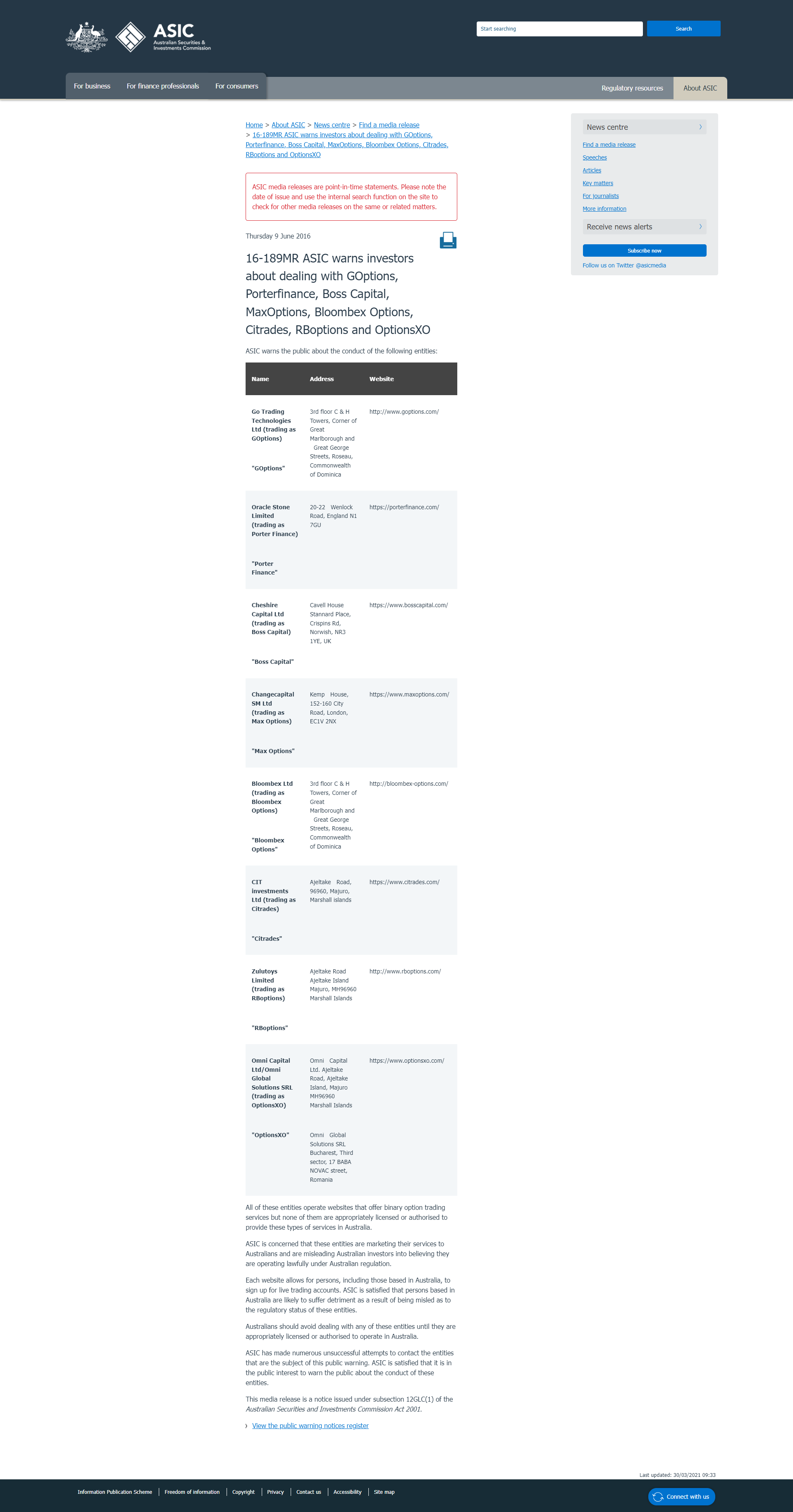 투자자 경고 목록 16-189MR ASIC은 GOptions, Porterfinance, Boss Capital, MaxOptions, Bloombex Options, Citrades, RBoptions 및 OptionsXO와 거래할 때 주의할 것을 투자자들에게 경고합니다..