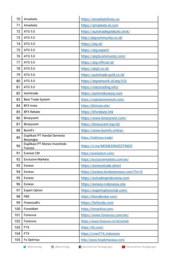 • 처벌 사유 상품선물거래규제청(Bappebti)을 통해 무역부는 2022년 1월~3월 동안 상품선물거래(PBK) 부문의 법인 웹사이트 도메인 218개를 차단했습니다.