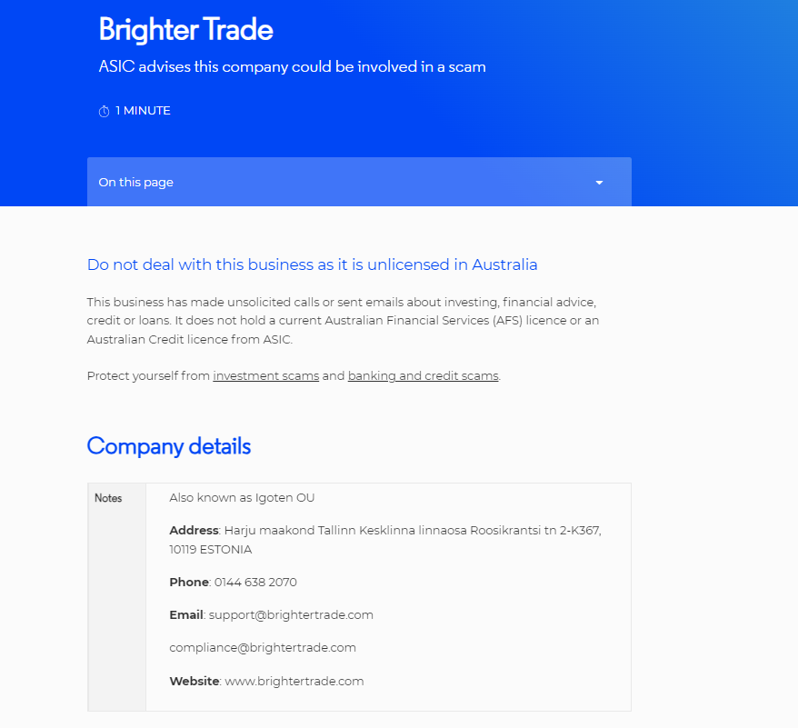 투자자 경고 목록 브라이터 트레이드 ASIC은 이 회사가 사기와 관련이 있을 수 있다고 경고합니다..