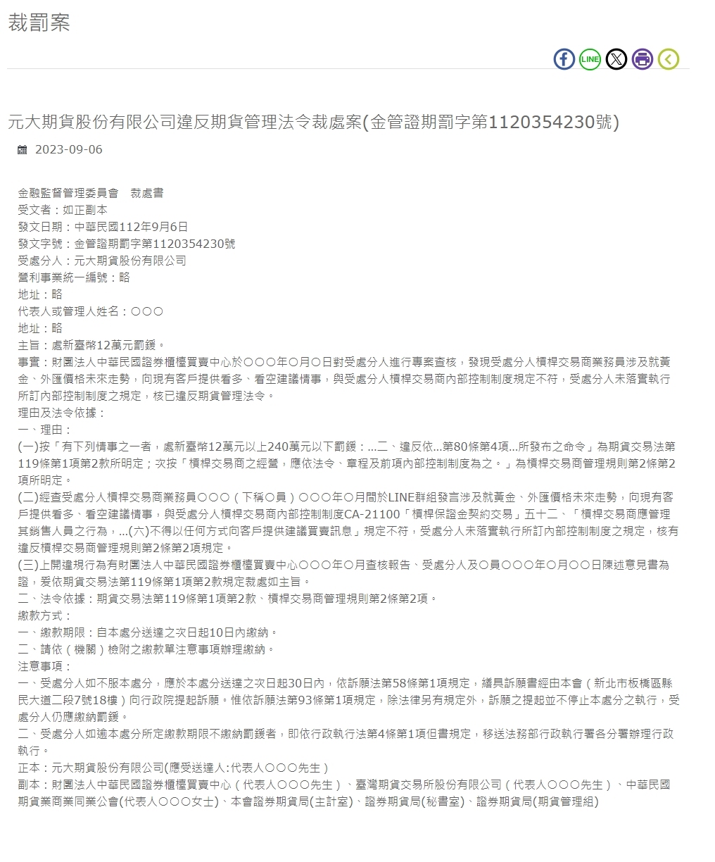 금융감독위원회 징계 대상자 : 원본 발행일 : 중화민국 112.9.6 발행번호 : 금융감독위원회 제1120354230호 처벌자 : 元大期貨股份有限公司 영리기업 통일번호: 약칭 주소: 대표자 또는 관리자 약칭: ○○○ 주소: 약칭 목적: NT$120,000의 벌금을 부과합니다. 사실 : 법인컨소시엄인 중화민국증권장외거래센터는 2000. 10. 0. 처벌대상자를 대상으로 특별조사를 실시한 결과 레버리지로 처벌받은 사람의 판매원이 적발된 사실을 확인함. 거래는 기존 고객에게 금 및 외환 가격의 미래 동향에 대한 정보를 제공하는 데 관여했습니다. 강세 및 약세 추천은 제재를 받은 레버리지 거래자의 내부 통제 시스템 조항과 일치하지 않았습니다. 제재를 받은 사람은 다음 조항을 이행하지 않았습니다. 내부통제시스템을 위반해 선물관리법을 위반한 것으로 드러났다. 이유 및 법적 근거: 1. 이유: (1) "다음 상황 중 하나를 범한 사람은 NT$120,000 이상 240만 이하의 벌금에 처해집니다. ... 2. 위반 제80조 제4항에 따라 공포된 규정... "주문"은 선물거래법 제119조 제1항 제2항에 규정되어 있으며, "레버리지거래자의 업무는 법령에 따라야 합니다. 및 전항의 내부 통제 시스템'은 레버리지 딜러 관리 규칙 제1조입니다. 제2조 제2항에 명시되어 있습니다. (2) 처벌 대상인 영업사원 ○○○(이하 ○회원)은 ○○○월 ○월 라인그룹에서 기존 고객들에게 긍정적인 정보를 제공하는 연설을 한 것으로 밝혀졌다. 금 및 외환 가격의 향후 추세, 공매도 조언 상황 및 처벌된 레버리지 거래자의 내부 통제 시스템 ca-21100 "레버리지 마진 계약 거래" 52. "레버리지 거래자는 영업 직원의 행동을 관리해야 하며, ... (6) "고객에게 추천하는 거래정보 제공"이 요구사항을 준수하지 않는 경우 어떠한 방식으로도 공개해서는 안 됩니다. 처벌 대상자는 내부 통제 시스템의 규정을 이행하지 않고 제2조 제1항의 규정을 위반한 것입니다. 2, 레버리지 거래자 관리 규칙. (3) 상기 위반행위는 ○○○월 중화민국증권장외거래센터의 검사보고서와 ○에 대한 처벌인 및 회원의 의견에 의하여 입증된다. ○연도 ○○월 선물거래법 제119조 제1항 제2항에 따르면 제재는 그 취지에 근거하여야 한다고 규정하고 있습니다. 2. 법적 근거 : 선물거래법 제119조 제1항 제2호, 레버리지딜러 관리규정 제2조 제2항. 납부방법 : 1. 납부기한 : 제재를 받은 날로부터 10일 이내에 납부한다. 2. (대행기관)에 첨부된 납부서의 주의사항에 따라 납부하시기 바랍니다. 참고: 1. 처벌 대상자가 이 처벌에 불복할 경우, 청원법 제58조 제1항의 규정에 따라 본 협회(신베이시 반차오구)를 통해 30일 이내에 청원서를 제출해야 합니다. 형이 선고된 다음 날부터 Xianmin Avenue 2단 7호 18층)이 행정원에 청원서를 제출했습니다. 다만, 민원법 제93조 제1항에 따르면, 법률에 특별한 규정이 없는 한, 상고를 제기하더라도 본 제재의 집행은 중단되지 않으며, 제재 대상자는 벌금을 납부해야 합니다. 2. 피처벌자가 이 형에서 정한 납부기한 내에 벌금을 납부하지 아니한 때에는 제1조 단서에 따라 법무부 행정집행부 소속 지부로 이송되어 행정집행을 하게 된다. 행정집행법 제4조제1항. 원래의: 元大期貨股份有限公司 (송달 예정자: 대표 ○○○ 씨) 사본: 중화민국증권장외거래센터(대표 ○○○ 씨), 대만선물거래소(대표 ○○○ 씨), 중국 중화민국선물협회(대표: ○○○ 여사), 협회 증권선물국(회계실), 증권선물국(비서실), 증권선물국(선물관리그룹)