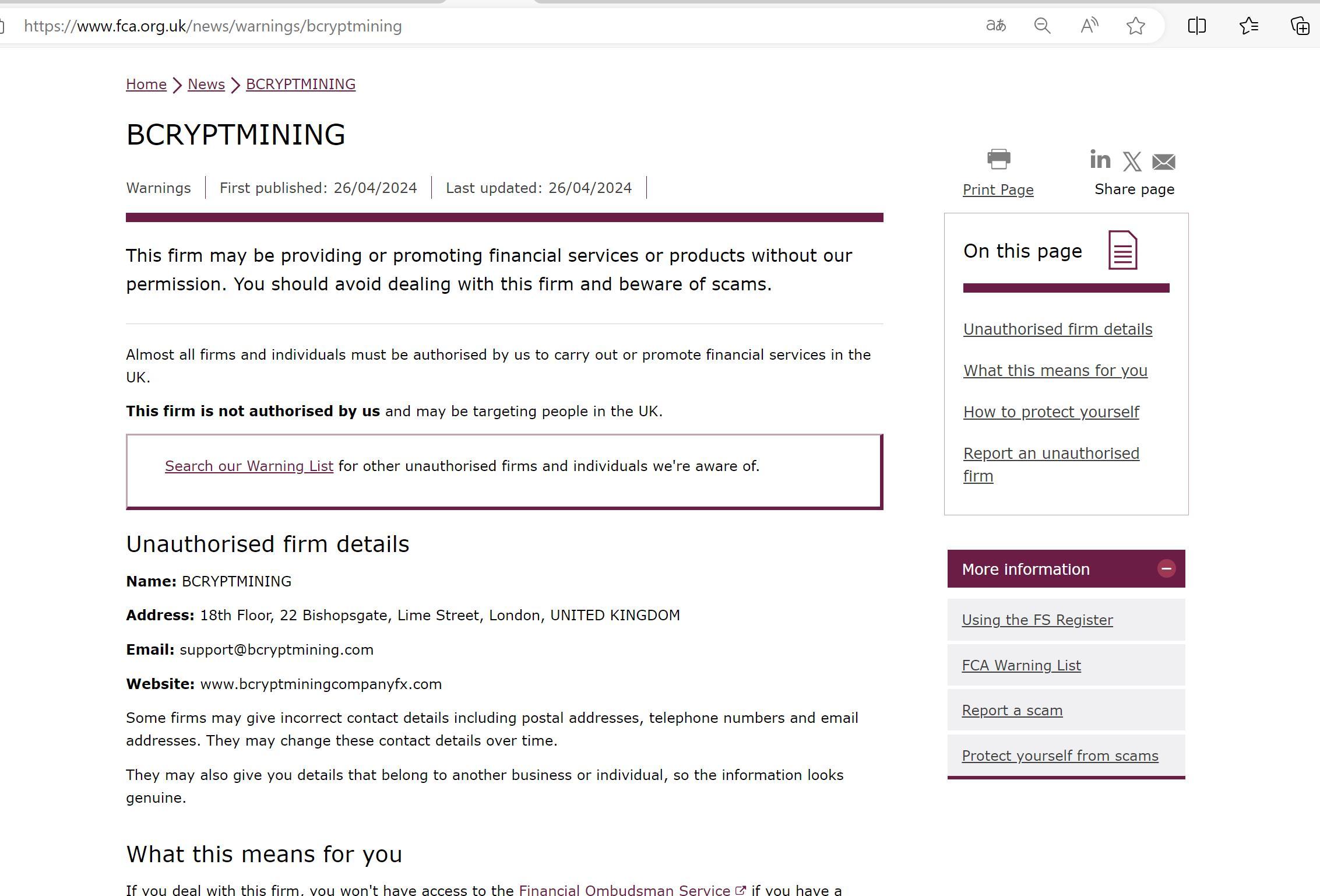FCA 무단 회사 경고 목록 BCRYPTMINING.