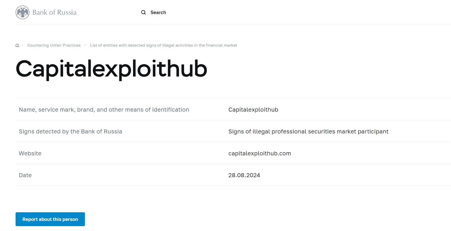 이름, 서비스 마크, 브랜드 및 기타 식별 수단 Capitalexploithub 러시아 은행이 감지한 불법 전문 증권 시장 참여자 웹사이트의 징후 Capitalexploithub .com 날짜 28.08.2024