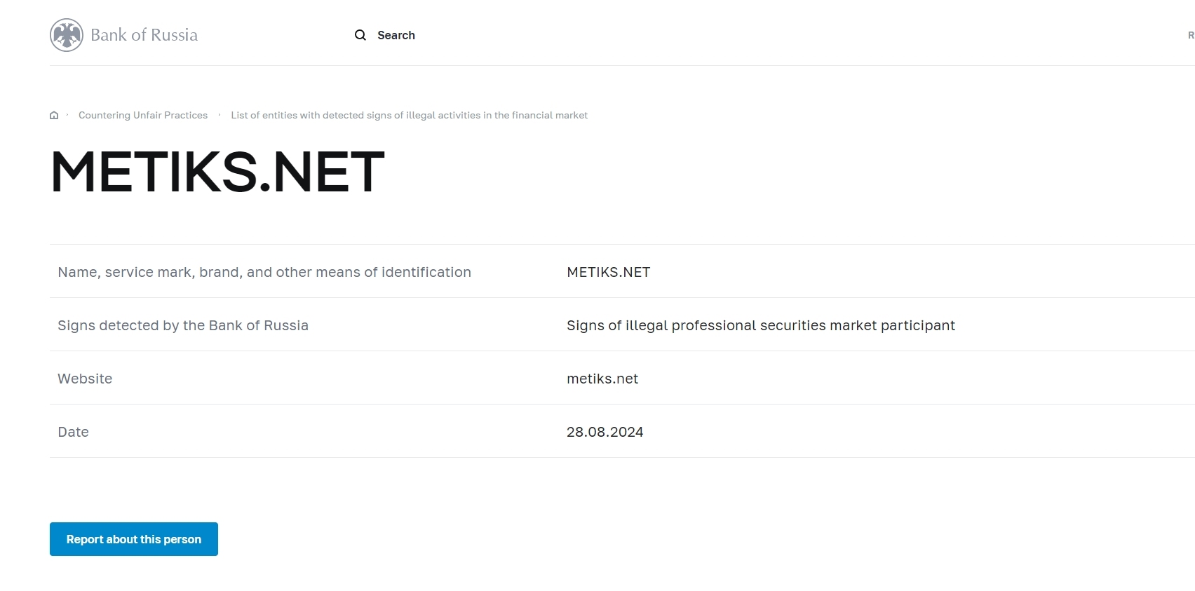 이름, 서비스 마크, 브랜드 및 기타 식별 수단 Metiks .net 러시아 은행에서 감지한 불법 전문 증권 시장 참여자 웹사이트의 징후 Metiks .net 날짜 28.08.2024