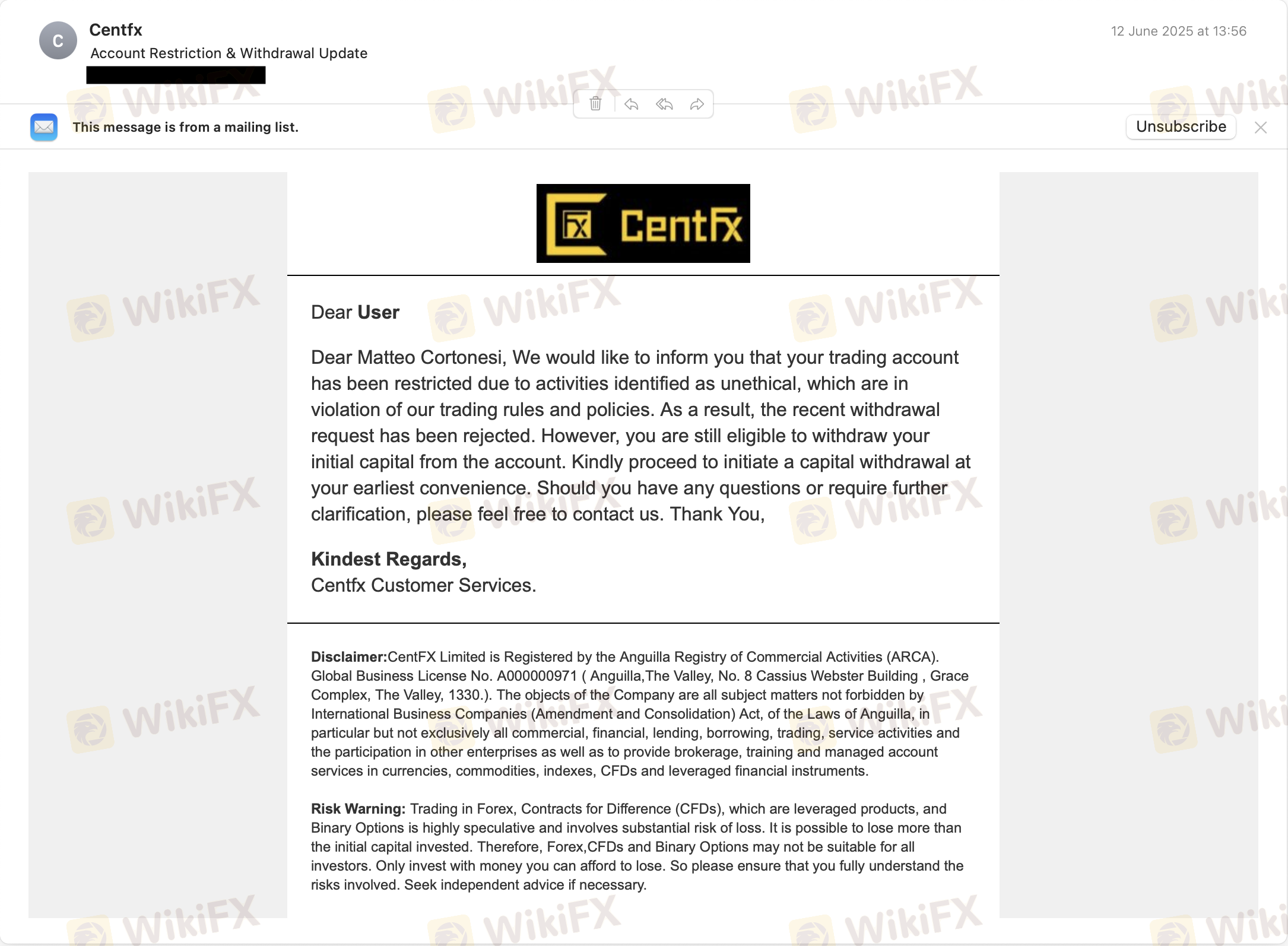 I deposited $3,900 into my CentFX.com account (#112355) and placed a successful short trade on GBPCHF on April 2, 2025, increasing my balance to $14,037. When I attempted to withdraw part of the profit in June, they abruptly rejected the request, claiming “unethical activity” without any evidence. Shortly after, my entire account — including MetaTrader access — was completely blocked. I am now locked out and cannot even retrieve my initial deposit. I emailed support multiple times (June 13, 15, and 23), but never received a response. I’m attaching: - The email accusing me of unethical activity - A screenshot showing my account is blocked - A screenshot proving the $14,037 balance CentFX has provided no explanation and is withholding my funds. This is a clear scam. Do not trust them — they stole my money.