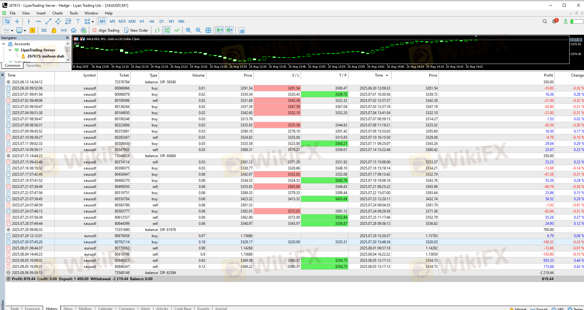 I opened an account with Liyan Broker and deposited $1,400. After some trades, I made around $819 profit and successfully withdrew $800.