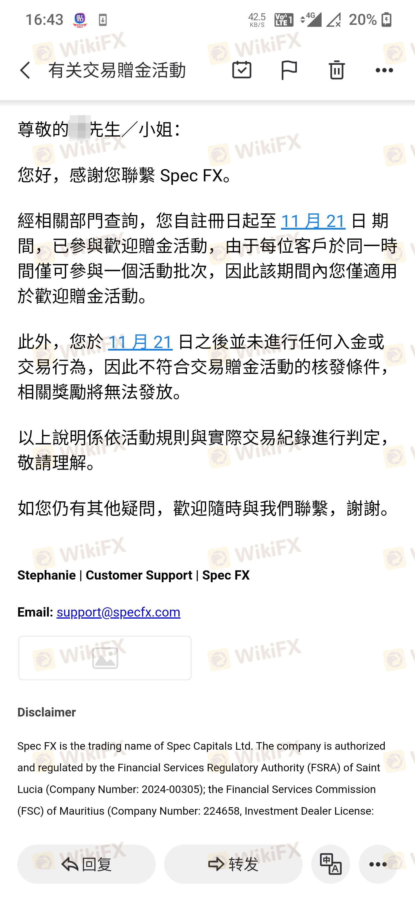 A plataforma spec lançou uma atividade onde, depositando 200 dólares e fazendo três lotes, você ganha 60 dólares em dinheiro. Eu cumpri todos os requisitos, procurei o suporte ao cliente da plataforma e eles não me deram.