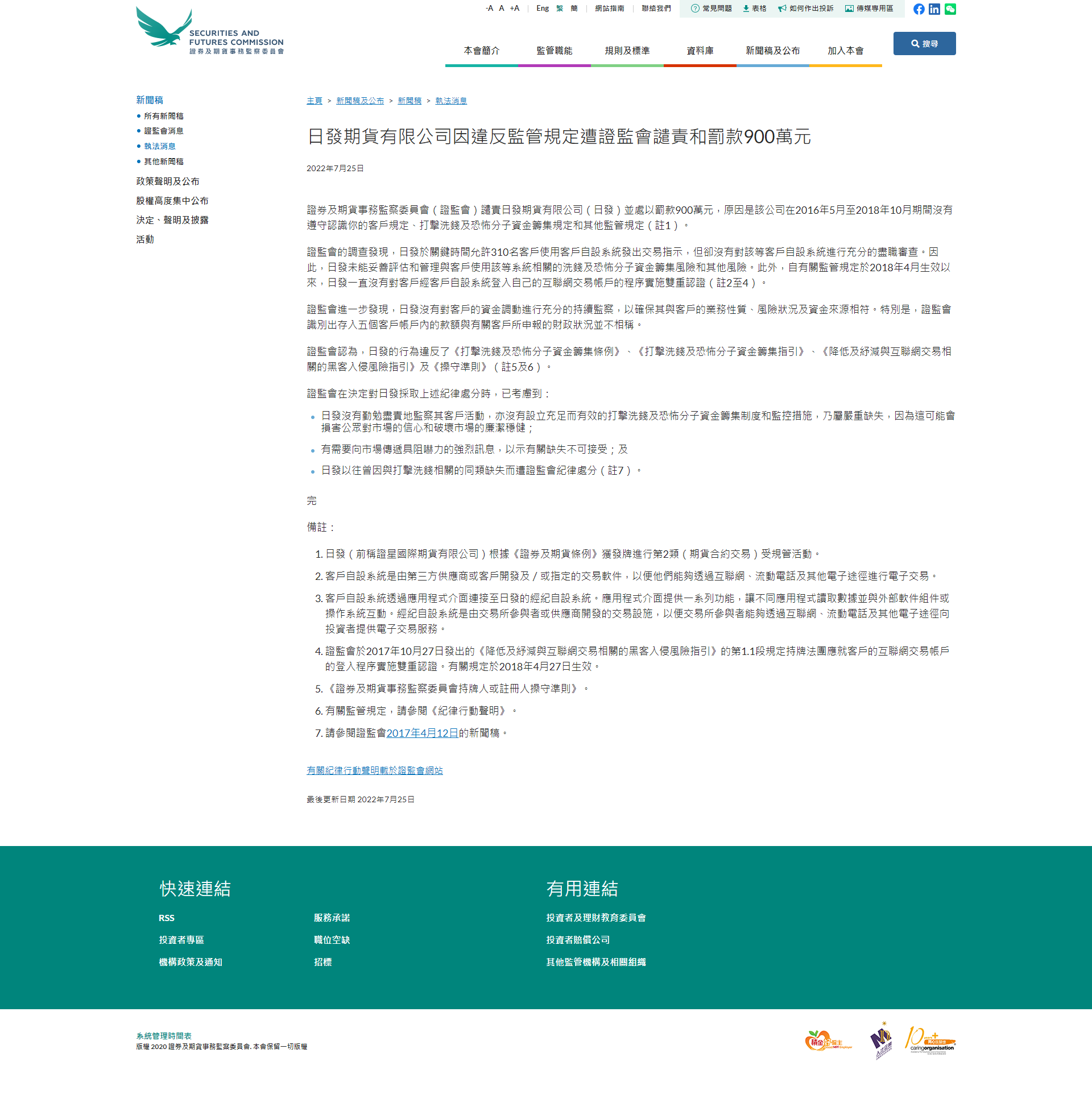 A Securities and Futures Commission (SFC) repreendeu e multou a Rifa Futures Limited (Rifa) em US$ 9 milhões por não cumprir os regulamentos de conhecimento do cliente entre maio de 2016 e outubro de 2018, regulamentos de combate à lavagem de dinheiro e financiamento do terrorismo e outros requisitos regulamentares (Nota 1). A investigação da SFC descobriu que a Rifa permitiu que 310 clientes usassem seus próprios sistemas para emitir instruções de negociação em momentos críticos, mas falhou em realizar a devida diligência suficiente nos próprios sistemas desses clientes. Como resultado, a Rifa falhou em avaliar e gerenciar adequadamente os riscos de lavagem de dinheiro e financiamento do terrorismo e outros riscos associados ao uso desses sistemas pelos clientes. Além disso, desde que os requisitos regulatórios relevantes entraram em vigor em abril de 2018, a Rifa não implementou a autenticação de dois fatores nos procedimentos para os clientes fazerem login em suas próprias contas de negociação na Internet por meio do próprio sistema do cliente (Notas 2 a 4). A SFC concluiu ainda que a Rifa falhou em monitorar de forma adequada e contínua as transferências de fundos do cliente para garantir que fossem consistentes com a natureza do negócio do cliente, perfil de risco e fonte de fundos. Em particular, o SFC identificou valores depositados em cinco contas de clientes que não eram compatíveis com as posições financeiras declaradas dos clientes. A Comissão Reguladora de Valores Mobiliários da China acredita que o comportamento de Rifa violou os "Regulamentos contra lavagem de dinheiro e financiamento do terrorismo", "Diretrizes para combater a lavagem de dinheiro e financiamento do terrorismo", "Diretrizes para reduzir e reduzir riscos de hacking relacionados a transações na Internet" e "Diretrizes de conduta " (Notas 5 e 6). Ao decidir tomar a ação disciplinar acima contra a Rifa, o SFC levou em consideração: a falha da Rifa em monitorar as atividades de seus clientes de forma diligente e consciente, e sua falha em estabelecer sistemas adequados e eficazes contra a lavagem de dinheiro e financiamento do terrorismo e medidas de monitoramento é deficiências graves, pois isso pode prejudicar a confiança pública no mercado e prejudicar a integridade do mercado; a necessidade de enviar uma mensagem forte e dissuasiva ao mercado de que as deficiências são inaceitáveis; Ação disciplinar do SFC para falhas semelhantes (Nota 7) . Observações Finais: A Rifa (anteriormente conhecida como Zhengxing International Futures Limited) está licenciada sob a Portaria de Valores Mobiliários e Futuros para exercer atividade regulada Tipo 2 (negociação de contratos futuros). Sistemas criados por clientes são softwares de negociação desenvolvidos e/ou especificados por fornecedores terceirizados ou clientes para permitir que eles realizem transações eletrônicas pela Internet, telefones celulares e outros meios eletrônicos. O sistema próprio do cliente é conectado ao sistema próprio da corretora Rifa através da API. As APIs fornecem um conjunto de funções que permitem que diferentes aplicativos leiam dados e interajam com componentes de software externos ou com o sistema operacional. Sistemas hospedados por corretores são instalações de negociação desenvolvidas por participantes ou fornecedores de bolsa para que os participantes de bolsa possam fornecer serviços de negociação eletrônica a investidores por meio da Internet, telefones celulares e outros meios eletrônicos. O parágrafo 1.1 das “Diretrizes para reduzir e mitigar os riscos de hacking relacionados ao comércio na Internet” emitido pelo SFC em 27 de outubro de 2017 estipula que as empresas licenciadas devem implementar autenticação de dois fatores para os procedimentos de login das contas de negociação na Internet dos clientes. A regulamentação entrou em vigor em 27 de abril de 2018. Código de Conduta para Pessoas Licenciadas ou Registradas na Securities and Futures Commission. Consulte a Declaração de Ação Disciplinar para obter os requisitos regulamentares. Consulte o comunicado de imprensa da SFC datado de 12 de abril de 2017. A declaração de ação disciplinar está disponível no site da SFC Última atualização em 25 de julho de 2022