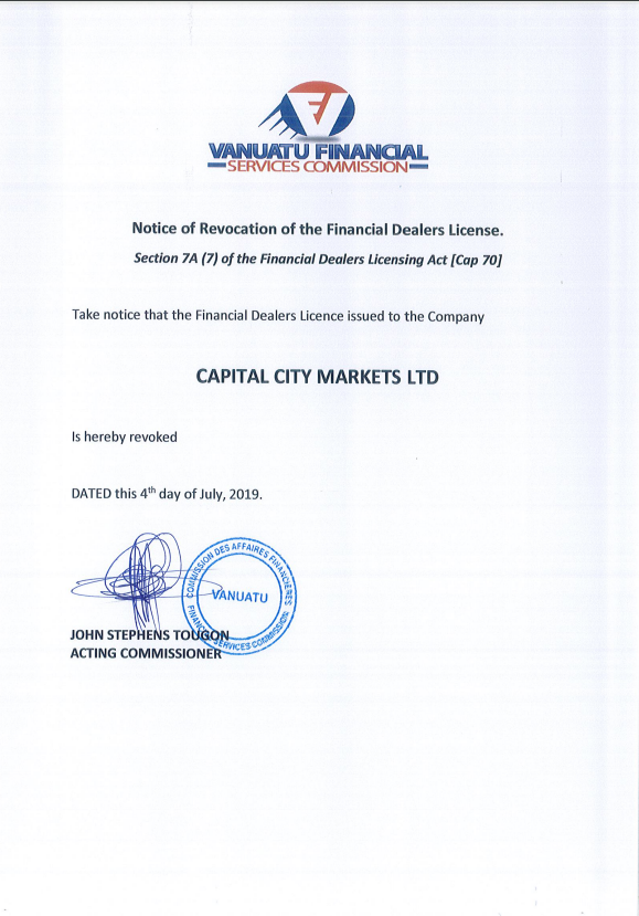 Aviso de Revogação da Licença de Negociante Financeiro. Seção 7A (7) da Lei de Licenciamento de Negociantes Financeiros [Cap 70] Observe que a Licença de Negociantes Financeiros emitida para a Empresa Capital City Markets LTD é revogada DATADO deste dia 4 de julho de 2019. SERAH OBED COMISSIONÁRIO INTERNO