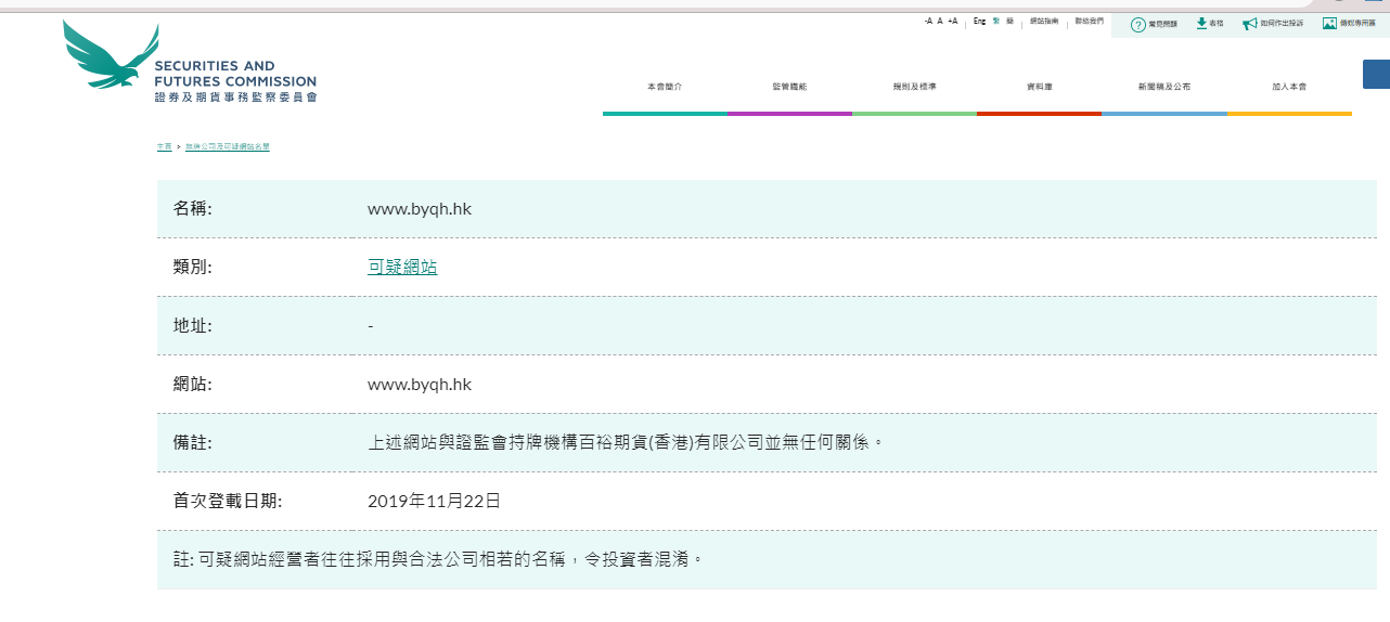 Nome: www.byqh.hk Categoria: Site Suspeito Endereço: - Site: www.byqh.hk Observações: O site acima não está relacionado a uma instituição licenciada pelo SFC 百裕期货 (Hong Kong) Co., Ltd. não tem nenhum relacionamento. Data da primeira publicação: 22 de novembro de 2019 Observação: operadores de sites suspeitos costumam usar nomes semelhantes a empresas legítimas, confundindo os investidores. " A lista de empresas não licenciadas e sites suspeitos lista empresas que não são licenciadas em Hong Kong e que atraíram a atenção do SFC. Essas empresas são suspeitas de serem ou estavam comercializando para investidores de Hong Kong ou alegando ter links para Hong Kong. Você pode pesquisar por nome ou categoria para ver se uma empresa está na lista. Esta lista não é exaustiva. Como o SFC geralmente encontra empresas ou sites importantes, novos são adicionados à lista de tempos em tempos. Se você já foi abordado por uma empresa não licenciada, use nosso formulário de reclamação on-line. Para obter mais informações sobre caldeiras, sites fraudulentos e e-mails de phishing, clique nos links relevantes. NOTA: A lista de empresas não licenciadas e sites suspeitos destina-se a emitir um alerta precoce aos investidores. Os investidores não podem confiar apenas nas informações da lista acima, eles precisam verificar cuidadosamente os detalhes de empresas individuais. Selecione a primeira letra em inglês do nome de cada coluna para visualizar a lista ou clique em "Nome chinês". A coluna pesquisa empresas apenas com nomes chineses."