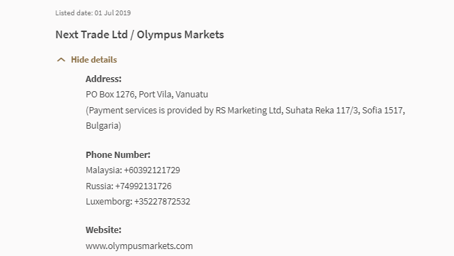 "lista de alerta ao investidor a lista de alerta ao investidor fornece uma lista de pessoas que, com base nas informações disponíveis para o mas, i) podem ser ou podem ter sido erroneamente consideradas licenciadas ou de qualquer outra forma autorizadas ou regulamentadas pelo mas; ii) fizeram uma oferta de unidades em um fundo empresarial ou esquema de investimento coletivo que pode ser ou pode ter sido erroneamente percebido como autorizado, reconhecido ou registrado pelo mas; iii) fez uma oferta de investimento que pode ser ou pode ter sido erroneamente percebido como sendo feito em ou acompanhado por um documento apresentado ou registrado no mas. esta lista não é exaustiva e é baseada no que era conhecido pelo mas no momento da publicação." data listada: 01 de julho de 2019 next trade ltd / Olympus Markets ocultar detalhes endereço: po box 1276, port vila, vanuatu (os serviços de pagamento são fornecidos pela rs marketing ltd, suhata reka 117/3, sofia 1517, bulgaria) número de telefone: malaysia: +60392121729 russia: +74992131726 luxemborg: +35227872532 website: www. Olympus market.com