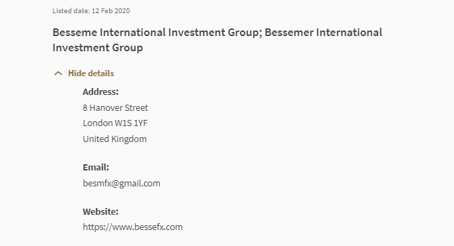 "lista de alerta ao investidor a lista de alerta ao investidor fornece uma lista de pessoas que, com base nas informações disponíveis para o mas, i) podem ser ou podem ter sido erroneamente consideradas licenciadas ou de qualquer outra forma autorizadas ou regulamentadas pelo mas; ii) fizeram uma oferta de unidades em um fundo empresarial ou esquema de investimento coletivo que pode ser ou pode ter sido erroneamente percebido como autorizado, reconhecido ou registrado pelo mas; iii) fez uma oferta de investimento que pode ser ou pode ter sido erroneamente percebido como sendo feito em ou acompanhado por um documento apresentado ou registrado no mas. esta lista não é exaustiva e é baseada no que era conhecido pelo mas no momento da publicação." data listada: 12 de fevereiro de 2020 BESSEME INTERNATIONAL INVESTMENT GROUP ; BESSEME r grupo de investimento internacional ocultar detalhes endereço: 8 hanover street london w1s 1yf reino unido e-mail: besmfx@gmail.com site: https://www.bessefx.com
