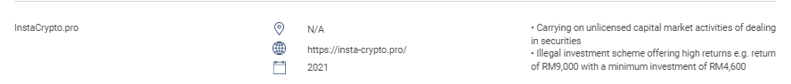 "Esta secção contém a lista de websites, produtos de investimento, empresas e indivíduos não autorizados. Esta lista inclui: Pessoas que exercem ou se autodenominam as seguintes actividades regulamentadas sem licença do SC: Negociação de valores mobiliários; Negociação de derivados; Gestão de fundos; Assessoria em finanças corporativas; Consultoria de investimento; Planejamento financeiro; e Negociação em esquemas privados de aposentadoria. Pessoas que operam um mercado reconhecido sem autorização. Pessoas que emitem ou oferecem valores mobiliários sem aprovação, autorização ou reconhecimento. Pessoas que fazem uso indevido do logotipo do SC e deturpam o SC. " InstaCrypto.pro N/A https://insta-crypto.pro/ 2021 • Realização de atividades não licenciadas no mercado de capitais de negociação de valores mobiliários • Esquema de investimento ilegal que oferece altos retornos, por exemplo, retorno de RM9.000 com um investimento mínimo de RM4.600