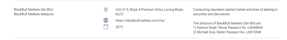 "esta seção contém a lista de sites, produtos de investimento, empresas e indivíduos não autorizados. Esta lista inclui: pessoas que exercem ou assumem exercer as seguintes atividades regulamentadas sem licença do sc: negociação de valores mobiliários; negociação de derivativos; gestão de fundos; assessoria em finanças corporativas; consultoria de investimento; planejamento financeiro; e negociação em esquemas privados de aposentadoria. pessoas que operam um mercado reconhecido sem autorização. pessoas que emitem ou oferecem valores mobiliários sem aprovação, autorização ou reconhecimento. pessoas que fazem uso indevido do logotipo do sc e deturpam o sc. " BlackBull mercados sdn bhd BlackBull mercados malaysia unit 21-9, binjai 8 premium soho, lorong binjai, klcc https:// BlackBull market.com/my/ 2019 conduzindo atividades regulamentadas do mercado de capitais de negociação de valores mobiliários e derivativos os diretores da BlackBull mercados sdn bhd são: 1) harlove singh talwar passaporte no. ln648694 2) michael grey walter passaporte no. ln910348