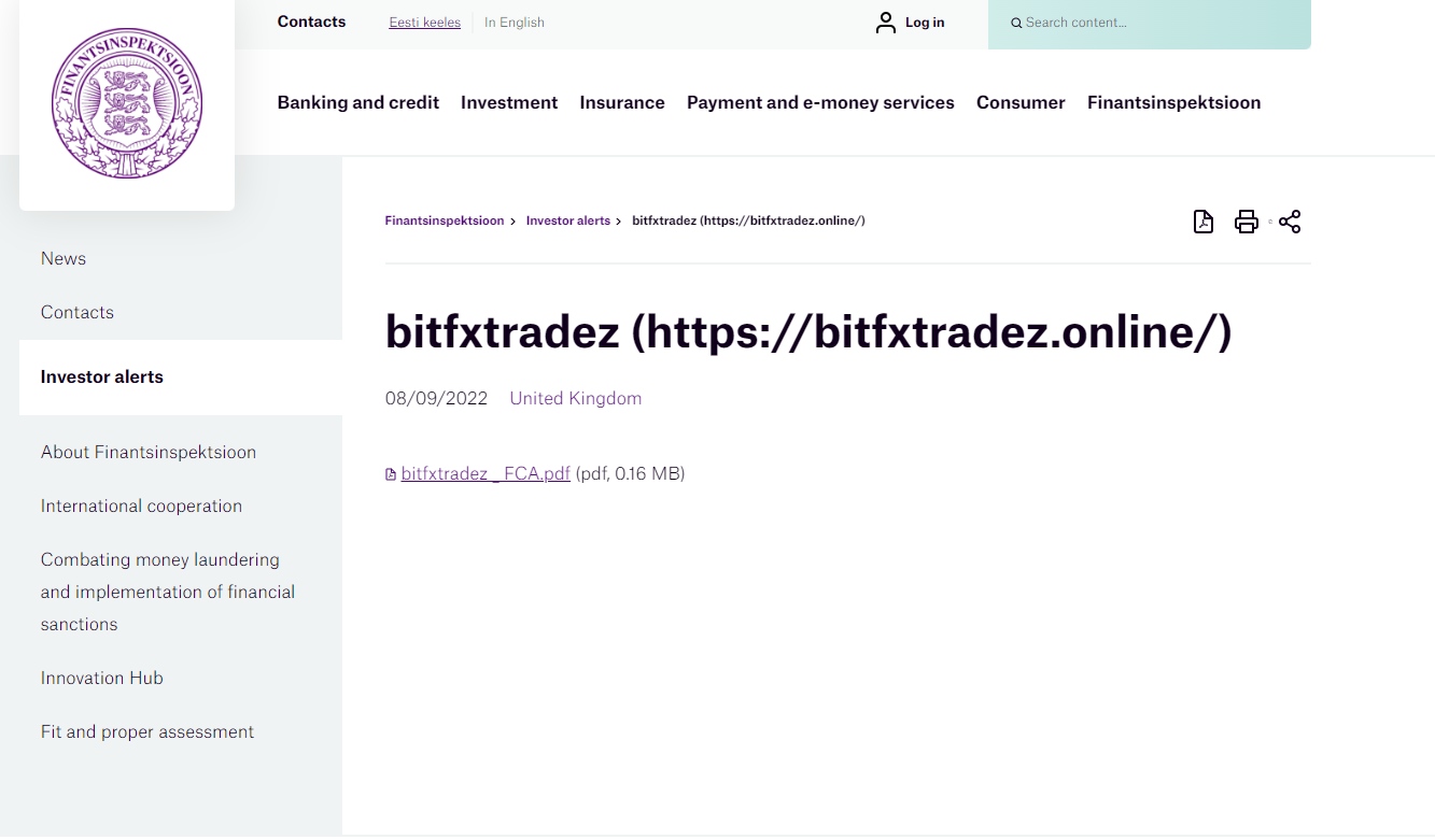 Alertas para investidores Finantsinspektsioon Alerta para Investidores - bitfxtradez (https://bitfxtradez.online/) 08/09/2022 Reino Unido.