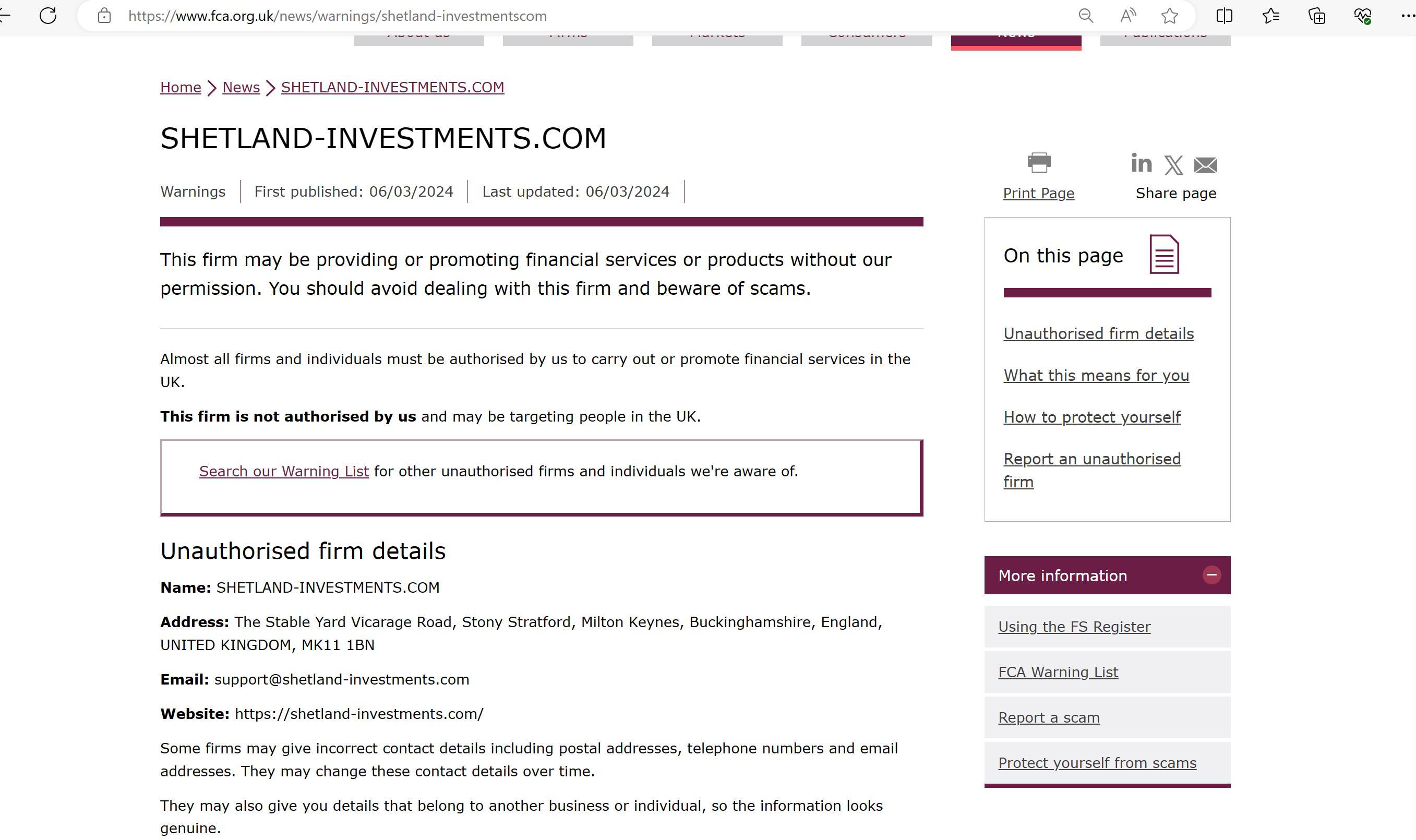 Lista de Aviso da FCA de empresas não autorizadas SHETLAND-INVESTMENTS.COM.