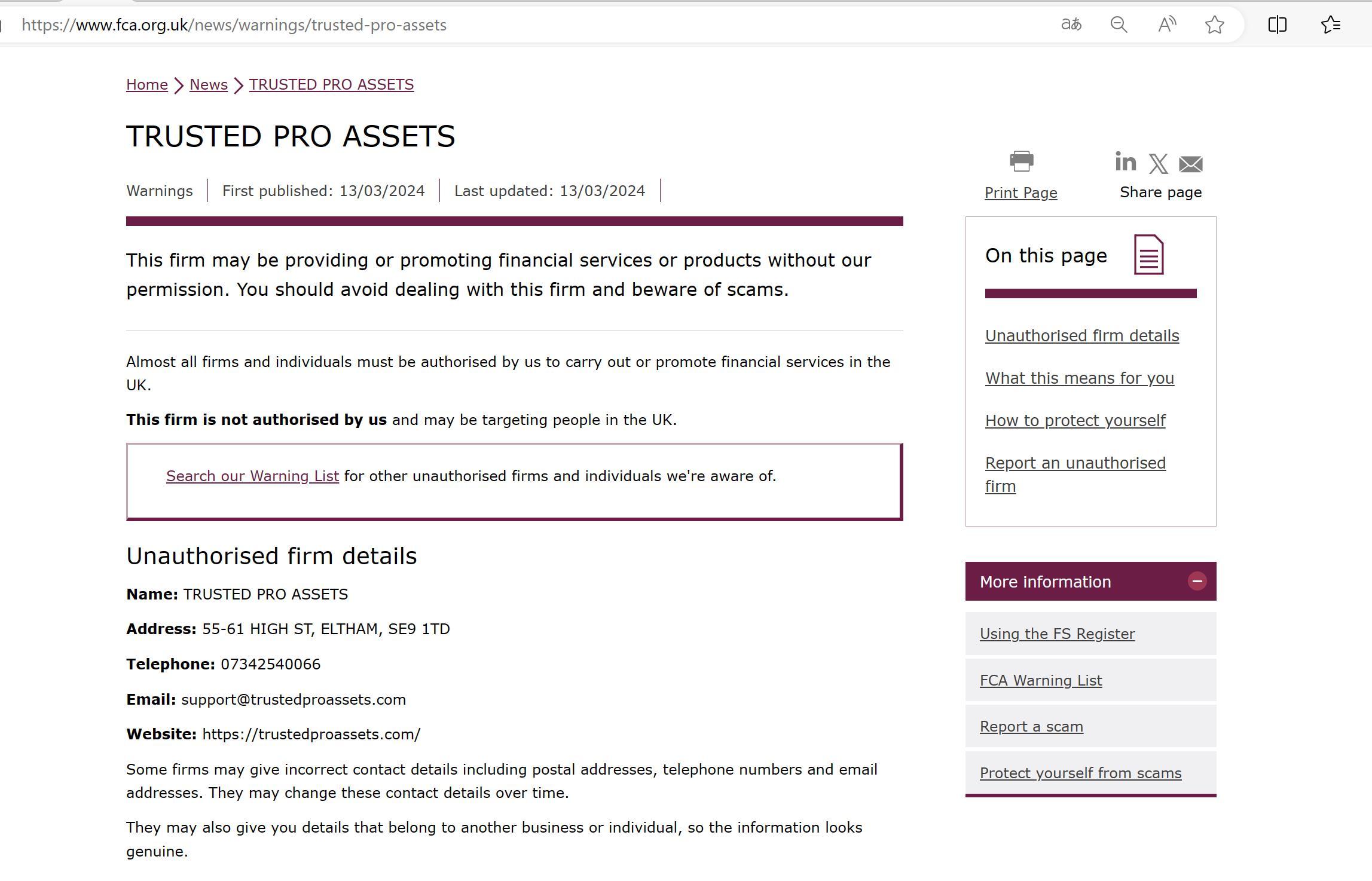 publicado pela primeira vez: 13/03/2024 última atualização: 13/03/2024 esta empresa pode estar fornecendo ou promovendo serviços ou produtos financeiros sem nossa permissão. você deve evitar lidar com esta empresa e tomar cuidado com golpes. quase todas as empresas e indivíduos devem ser autorizados por nós a realizar ou promover serviços financeiros no Reino Unido. esta empresa não é autorizada por nós e pode ter como alvo pessoas no Reino Unido. pesquise em nossa lista de alertas outras empresas e indivíduos não autorizados de que tenhamos conhecimento. detalhes da empresa não autorizada nome: TRUSTED PRO ASSETS endereço: 55-61 high st, eltham, se9 1td telefone: 07342540066 e-mail: support@trustedproassets.com site: https://trustedproassets.com/ algumas empresas podem fornecer detalhes de contato incorretos, incluindo endereços postais, números de telefone e endereços de e-mail. eles podem alterar esses detalhes de contato ao longo do tempo. eles também podem fornecer detalhes que pertencem a outra empresa ou indivíduo, para que as informações pareçam genuínas.
