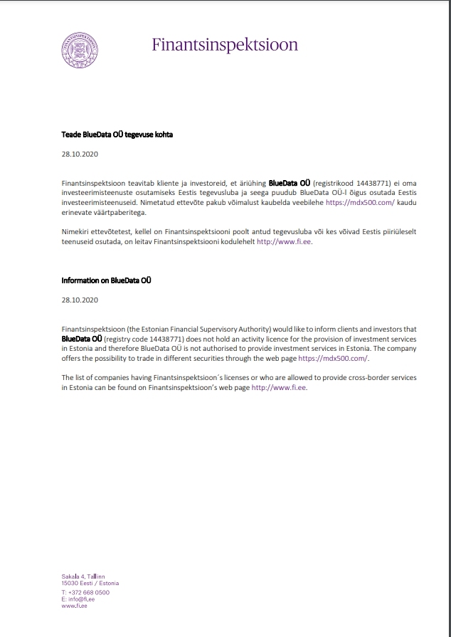 aviso sobre as atividades da bluedata oü 28.10.2020 a inspeção financeira informa clientes e investidores que a empresa bluedata oü (código de registo 14438771) não possui licença de atividade na Estónia para prestar serviços de investimento e, portanto, a bluedata oü não tem o direito de prestar serviços de investimento na Estônia. a referida empresa oferece a possibilidade de negociar no site https:// MDX500 .com/ com vários títulos. uma lista de empresas que possuem uma licença de operação emitida pela Autoridade de Supervisão Financeira ou que podem prestar serviços além-fronteiras na Estónia pode ser encontrada no site da Autoridade de Supervisão Financeira em http://www.fi.ee. informações sobre bluedata oü 28.10.2020 finansinspektsioon (a autoridade de supervisão financeira da Estónia) gostaria de informar os clientes e investidores que a bluedata oü (código de registo 14438771) não possui uma licença de atividade para a prestação de serviços de investimento na Estónia e, portanto, a bluedata oü não é autorizado a prestar serviços de investimento na Estónia. a empresa oferece a possibilidade de negociar diversos valores mobiliários através da página web https:// MDX500 .com/. a lista de empresas titulares de licenças da finansinspektsioon ou que estão autorizadas a prestar serviços transfronteiriços na Estónia pode ser encontrada na página web da finansinspektsioon http://www.fi.ee.