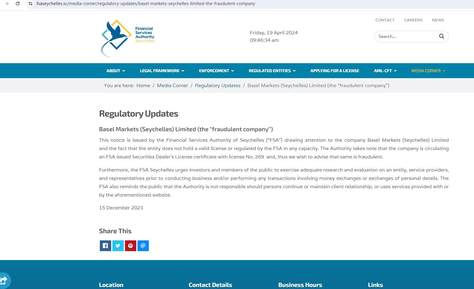 The Seychelles Financial Services Authority(FSA) is an autonomous regulatory body responsible for the non-bank financial services in Seychelles. Established under the Financial Services Authority Act, 2013, FSA is responsible for permitting and regulating licenses, enforcing regulatory and compliance requirements, monitoring and supervizing the conduct of business in the non-bank financial services sector in Seychelles. The regulated activities include fiduciary services, capital market & collective investment schemes, insurance, gambling. FSA is also responsible for the registration of international business companies, foundations, limited partnership and international trust in Seychelles.