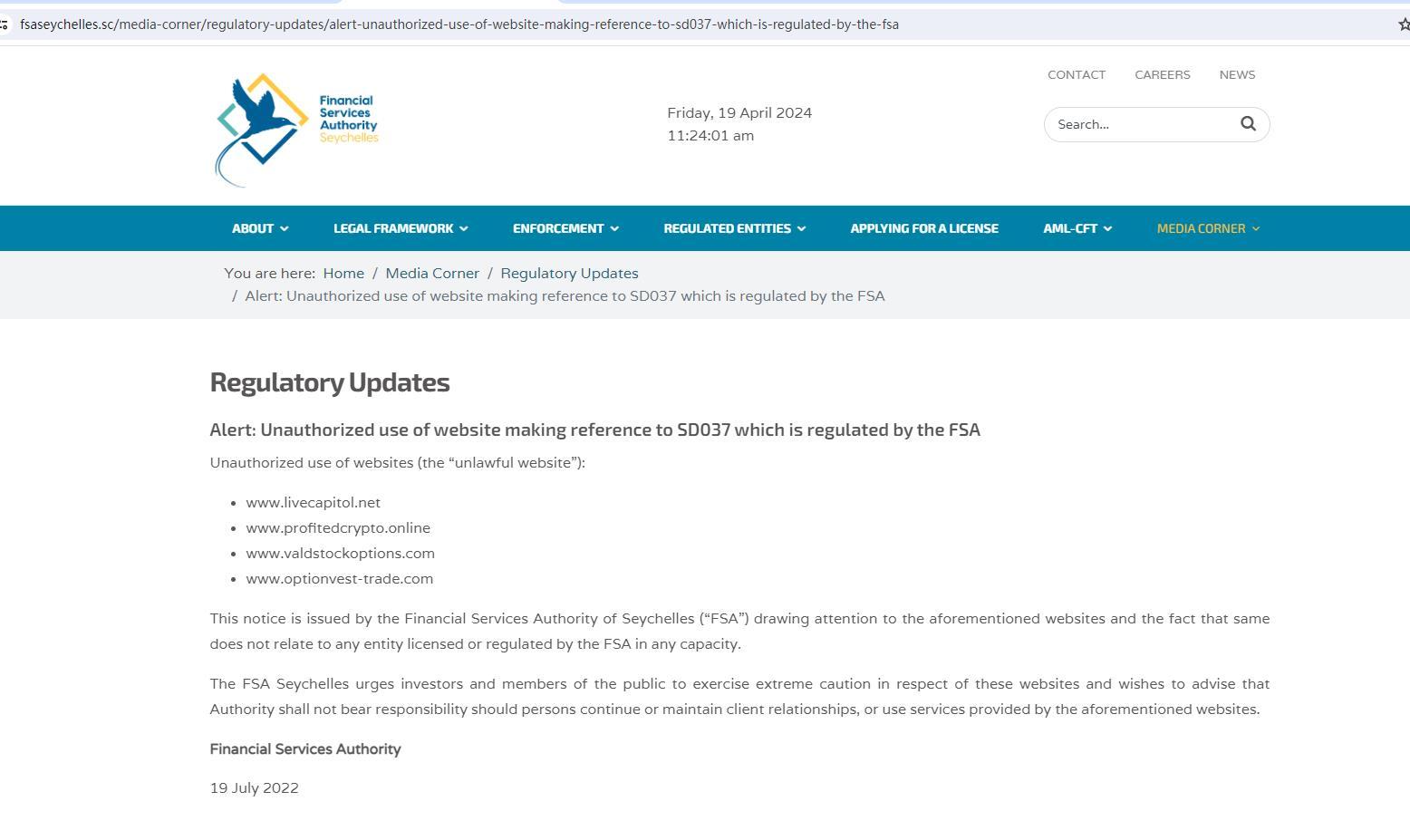 Alerta de atualizações regulatórias: Uso não autorizado de site fazendo referência ao SD037, que é regulamentado pela FSA Uso não autorizado de sites (o “site ilegal”): www.livecapitol.net www.profitedcrypto.online www.valdstockoptions.com www.optionvest-trade .com Este aviso é emitido pela Autoridade de Serviços Financeiros das Seychelles (“FSA”) chamando a atenção para os sites mencionados acima e para o fato de que os mesmos não se relacionam com nenhuma entidade licenciada ou regulamentada pela FSA em qualquer capacidade. A FSA Seychelles insta os investidores e membros do público a exercerem extrema cautela em relação a estes websites e deseja informar que a Autoridade não assumirá responsabilidade caso as pessoas continuem ou mantenham relações com clientes, ou utilizem serviços prestados pelos websites acima mencionados. Autoridade de Serviços Financeiros 19 de julho de 2022