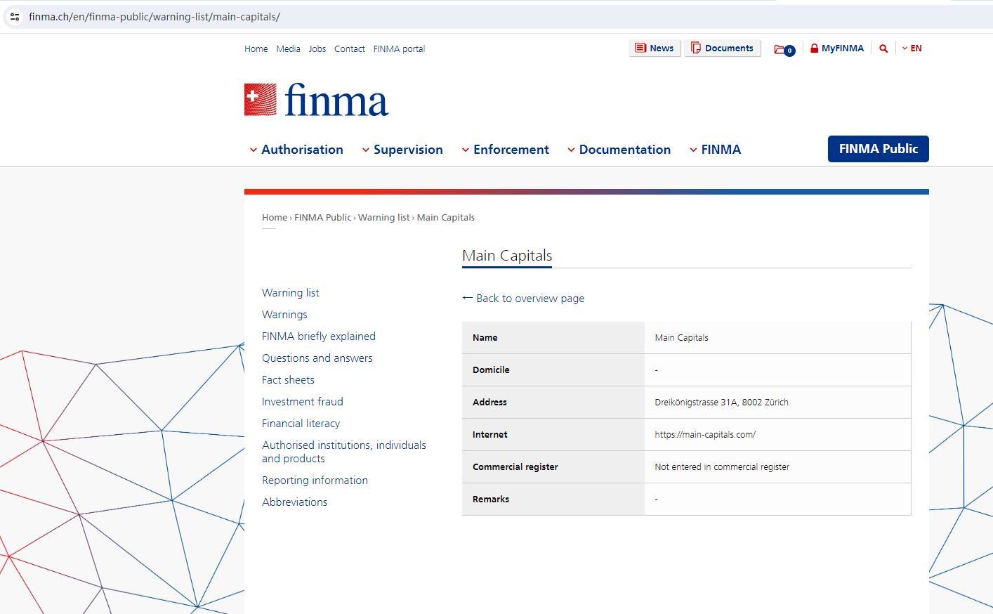 Lista de alerta de empresas e indivíduos não autorizados Lista de Alerta - https://main-capitals.com/.