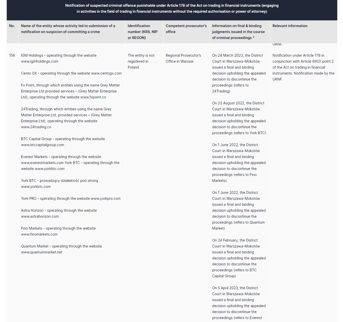 york pro - operando através do site www. Yorkpro .com ASTRA HORIZON - operando através do website www.astrahorizon.com a entidade não está registada na polónia procuradoria regional em varsóvia em 3 de novembro de 2022 o procurador regional adjunto em varsóvia emitiu uma decisão confirmando a decisão recorrida do gabinete do procurador distrital em varsóvia de 27 de setembro, 2022 sobre a recusa de reabertura da investigação (refere-se ao york pro) notificação nos termos do artigo 178.º em conjugação com o artigo 69.º, n.º 2, ponto 2, da lei sobre a negociação de instrumentos financeiros. notificação feita pelo uknf.