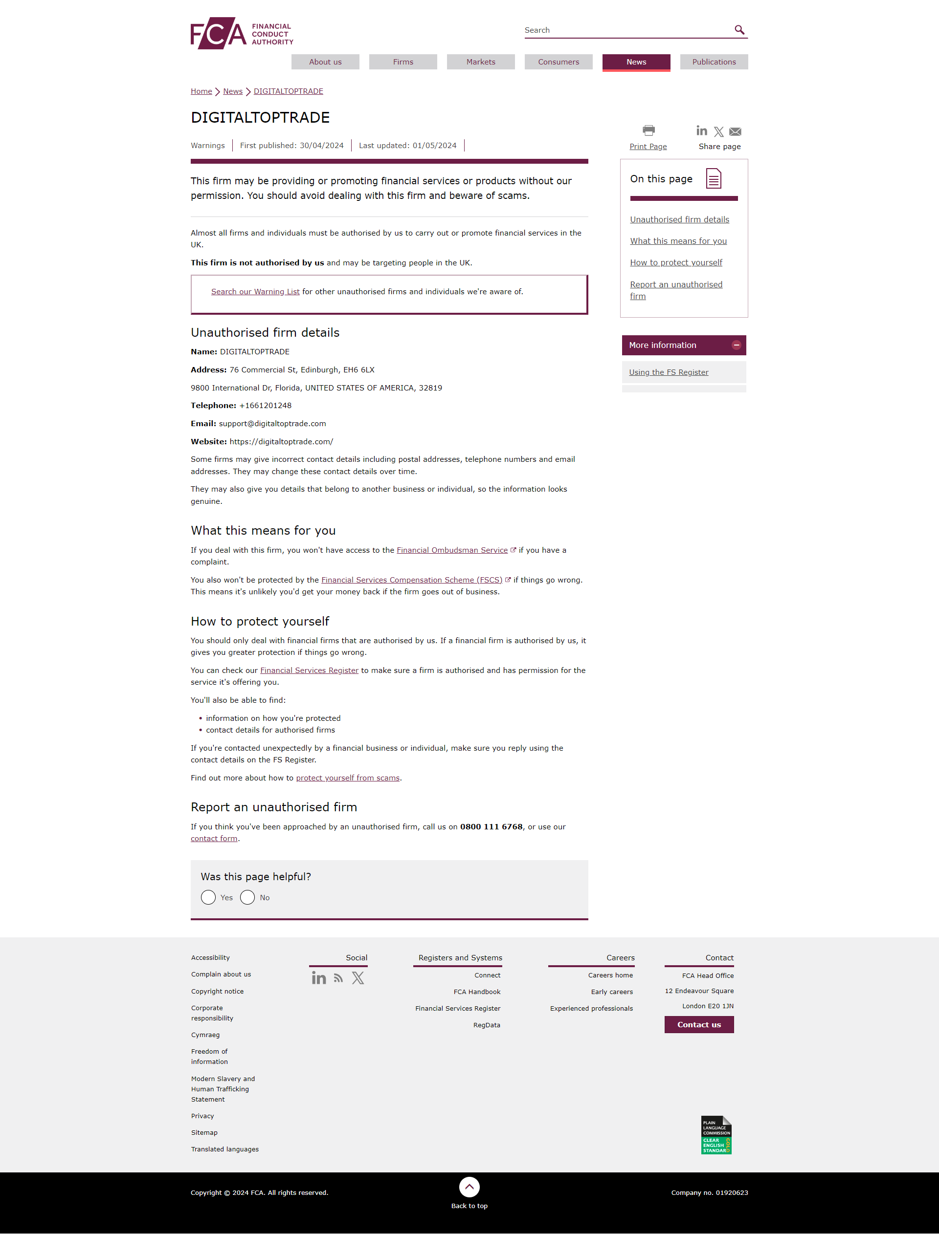 Lista de Aviso da FCA de empresas não autorizadas DIGITALTOPTRADE.