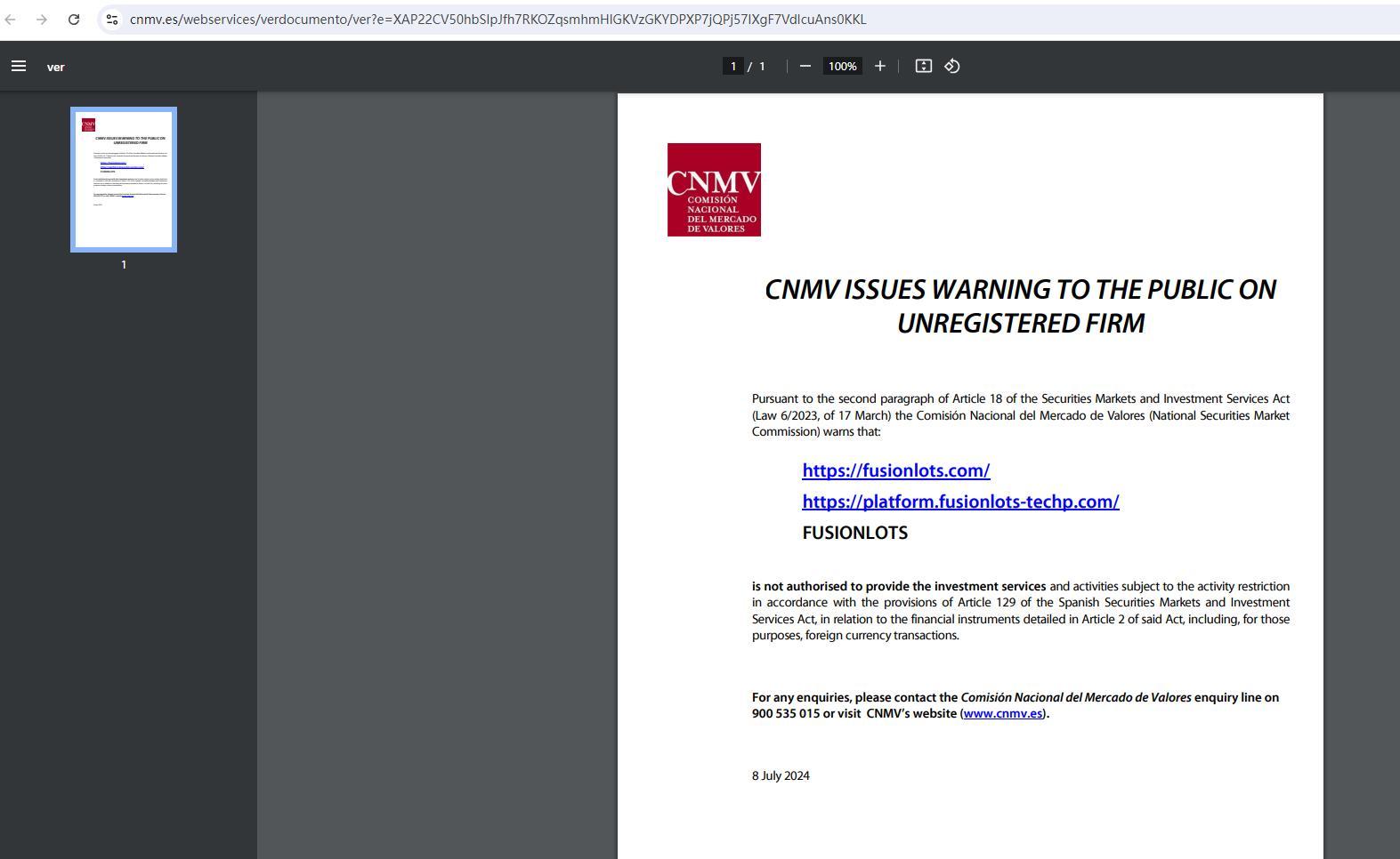 A cnmv emite alerta ao público sobre empresa não registrada, de acordo com o segundo parágrafo do artigo 18 da lei de mercados de valores mobiliários e serviços de investimento (lei 6/2023, de 17 de março). A comisión nacional del mercado de valores (comissão nacional do mercado de valores) alerta que: https:// FusionLots .com/ https://plataforma. FusionLots -techp.com/ FusionLots não está autorizada a prestar os serviços e atividades de investimento sujeitos à restrição de atividade de acordo com as disposições do artigo 129 da lei espanhola de mercados de valores mobiliários e serviços de investimento, em relação aos instrumentos financeiros detalhados no artigo 2 da referida lei, incluindo, para esses fins, transações em moeda estrangeira. para qualquer dúvida, entre em contato com a linha de consulta da comisión nacional del mercado de valores no número 900 535 015 ou visite o site da cnmv (www.cnmv.es). 8 de julho de 2024