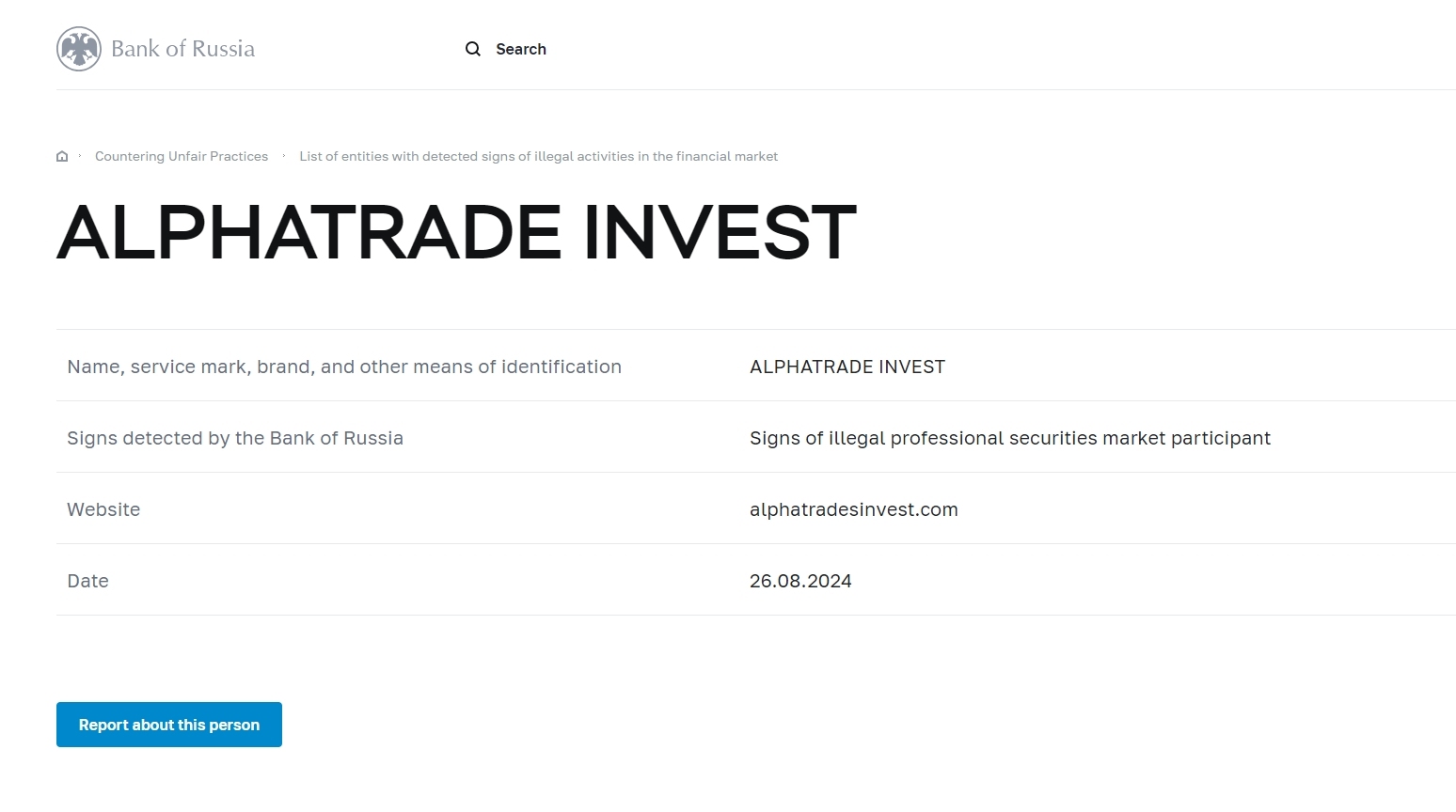 Nome, marca de serviço, marca e outros meios de identificação ALPHATRADE INVEST Sinais detectados pelo Banco da Rússia Sinais de participante ilegal do mercado de valores mobiliários profissional Site alphatradesinvest.com Data 26.08.2024