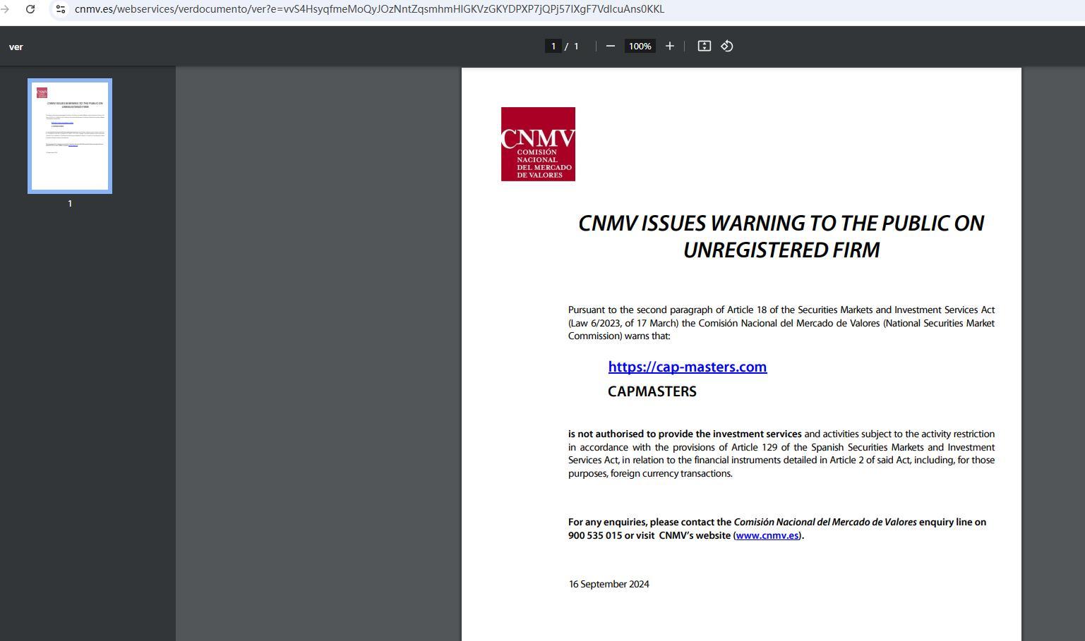 A cnmv emite alerta ao público sobre empresa não registrada, de acordo com o segundo parágrafo do artigo 18 da lei de mercados de valores mobiliários e serviços de investimento (lei 6/2023, de 17 de março). A comisión nacional del mercado de valores (comissão nacional do mercado de valores) alerta que: https:// Cap-Masters .com capmasters não está autorizado a fornecer os serviços e atividades de investimento sujeitos à restrição de atividade de acordo com as disposições do artigo 129 da lei espanhola de mercados de valores mobiliários e serviços de investimento, em relação aos instrumentos financeiros detalhados no artigo 2 da referida lei, incluindo, para esses fins, transações em moeda estrangeira. Para quaisquer dúvidas, entre em contato com a linha de consulta da comisión nacional del mercado de valores no número 900 535 015 ou visite o site da cnmv (www.cnmv.es). 16 de setembro de 2024