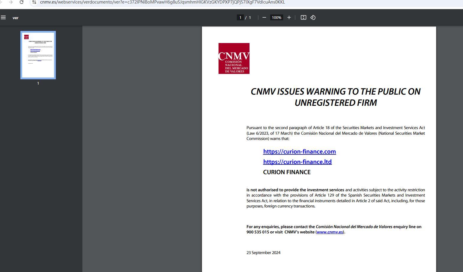 • Motivo da penalização https://curion-finance.com https://curion-finance.ltd Curion Finance não está autorizada a prestar os serviços e atividades de investimento sujeitos à restrição de atividade, de acordo com as disposições do artigo 129 da lei espanhola de mercados de valores mobiliários e serviços de investimento